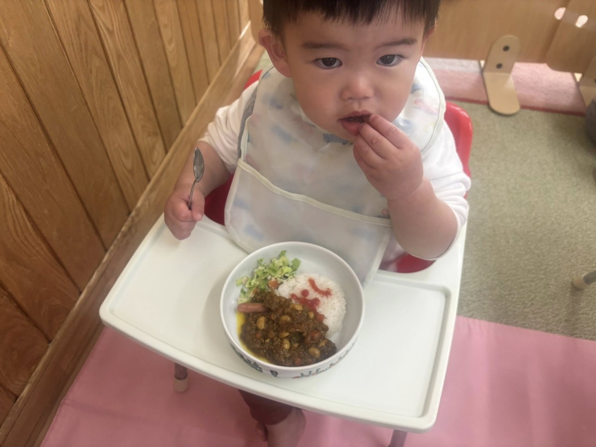 | 午前中は室内と園庭に分かれて遊びました。園庭では1歳児クラスのお友だちと関わりながら遊ぶ様子が見られました。室内ではスロープを走る車に目が釘付けになっていました。今日が節分ということもあり給食は鬼面ライスでした。みんなしっかりと食べて鬼退治ができたようです。 |