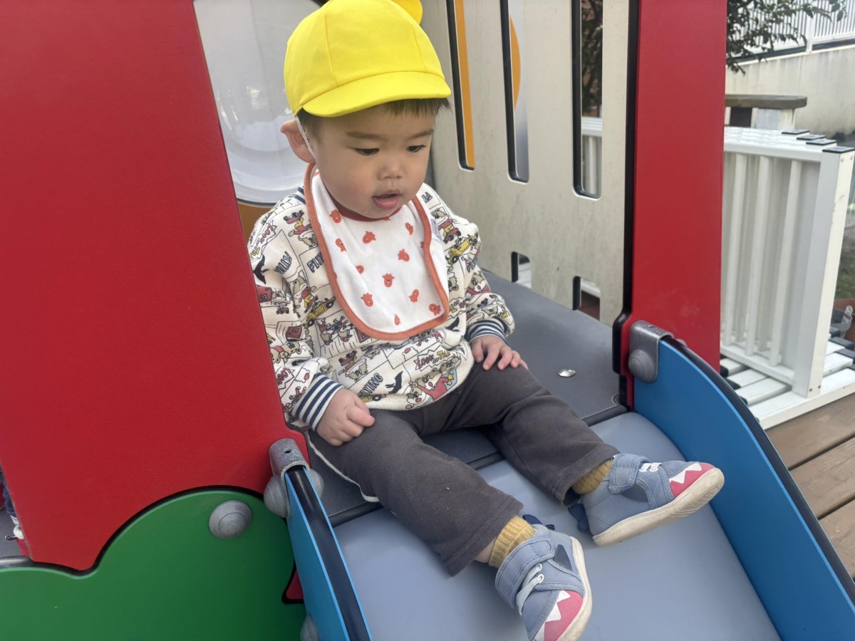 | 今日は室内と園庭に分かれて遊びました。園庭ではデッキの滑り台で遊びました。お友だちが滑っているのを見て「楽しそう」と目をキラキラさせて階段を登ってくる様子が可愛らしかったです。室内ではスロープにボールを転がして遊びました。スロープの途中でボールを止めようと追いかけていました。 |