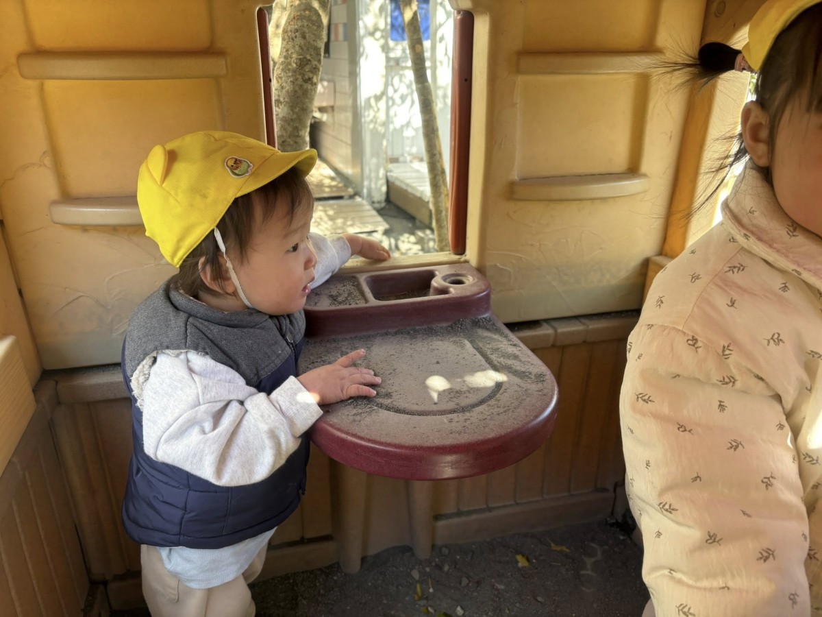 | 今日は園庭で遊びました。1歳児さんが遊んでいる様子を見て一緒にかけっこをしたりスモールハウスの中でおもちゃを一緒に使いながら仲良く遊んでいました。 |