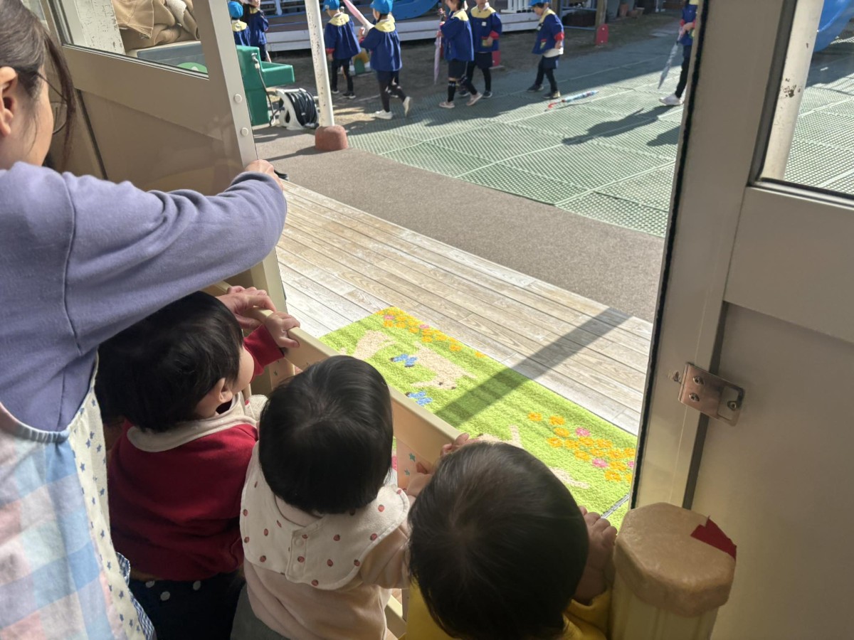 | 今日は園庭と室内に分かれて遊びました。園庭にあお組さんの交通教室の様子を興味津々で室内や園庭から見ていました。 |