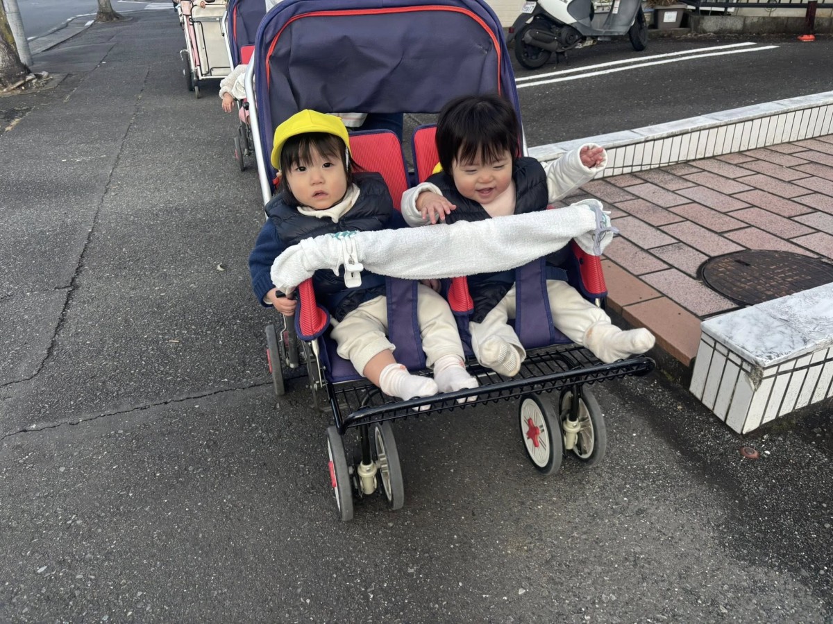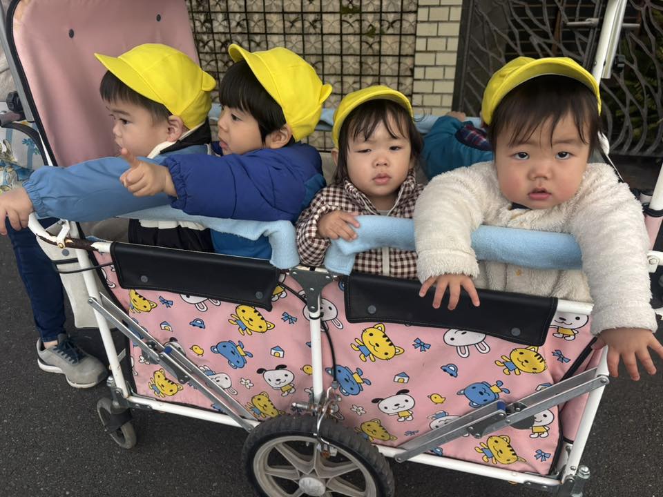 | 今日はベビーカーに乗りお散歩に出かけました。園内では見られない景色や様々な車の姿に興味津々な様子でした。通り去っていく車に向かって一生懸命手を振る姿がとても可愛かったです。 |