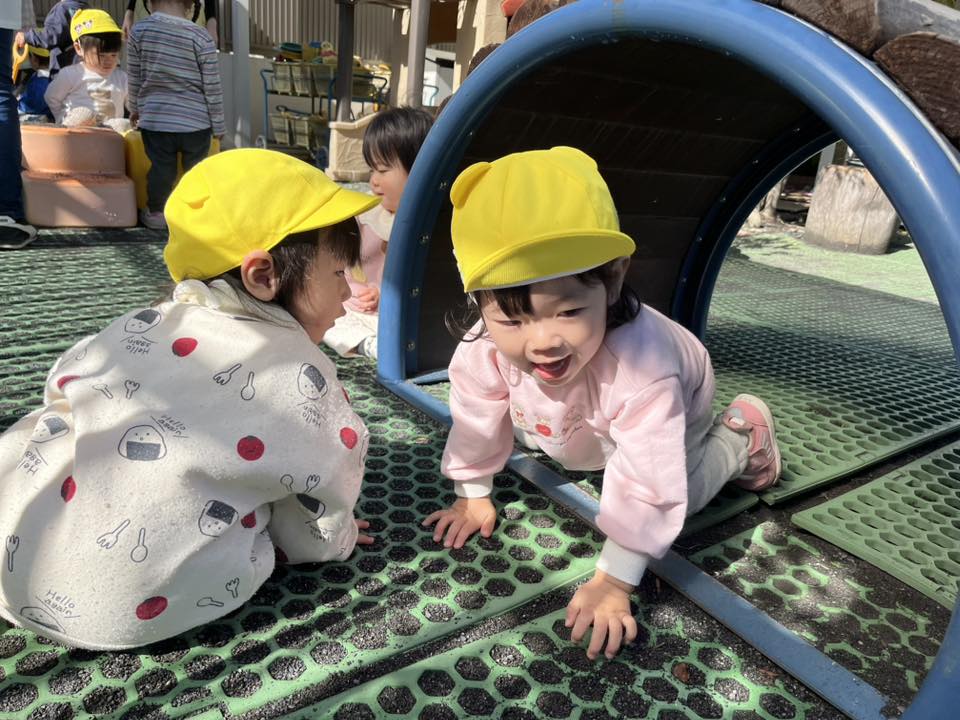 | 今日は室内で遊びました。ミニテントの影に隠れてから顔を出すとみんな大喜びして笑っています。トンネル滑り台では滑るだけでなく窓や後ろから中にいるお友だちに声を出して声をかけて遊ぶ姿も見られました。 |