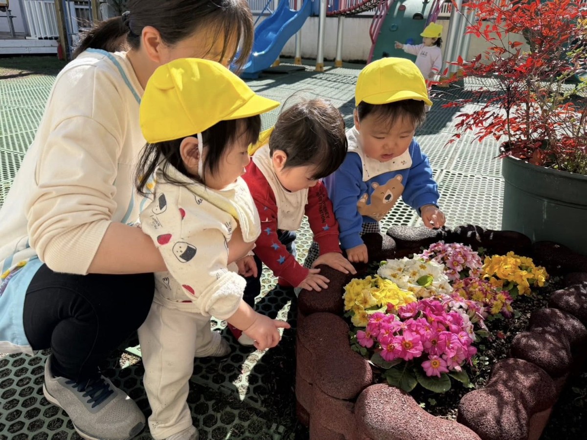 | 園庭で遊びました。雨上がりの砂場は型抜きがしやすく、自分でやってみて形になるとおおっ!と喜んでいました。花壇のお花を「かわいいね」「きれいだね」と保育士と一緒に興味津々に見ていました。 |