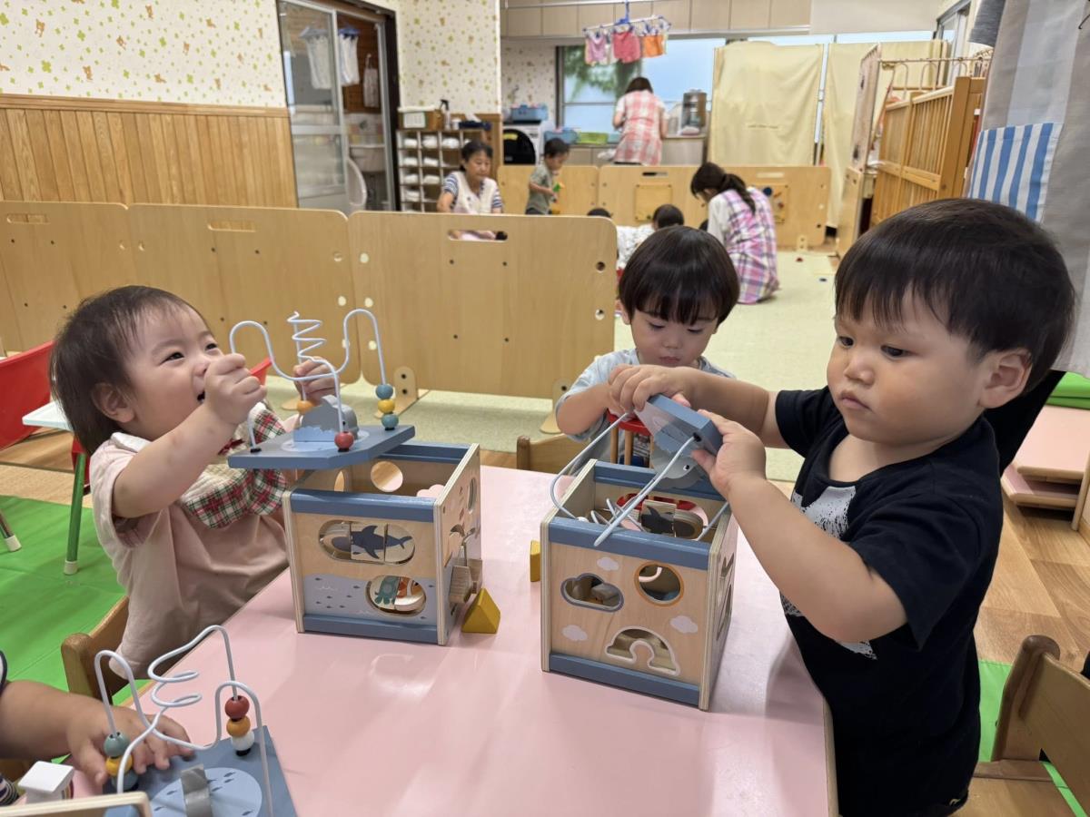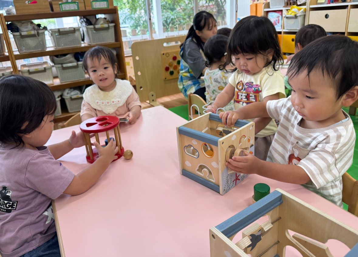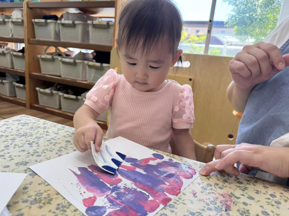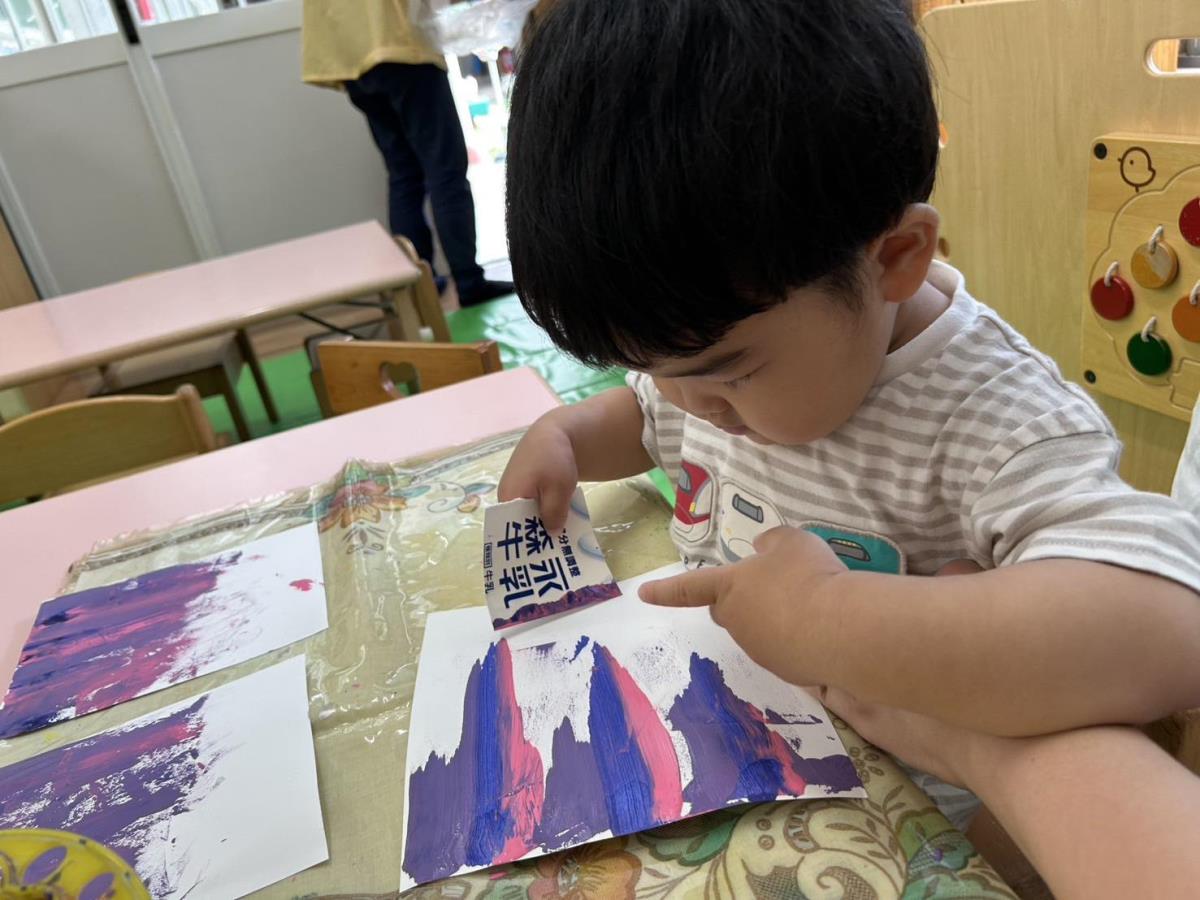 | 室内で過ごしました。絵の具を使って制作をしたり、ブロックや型はめパズルで遊びました。型はめのパズルを1つ1つ手に取って「ここ?」と先生に聞きながらはめて楽しみました。 |