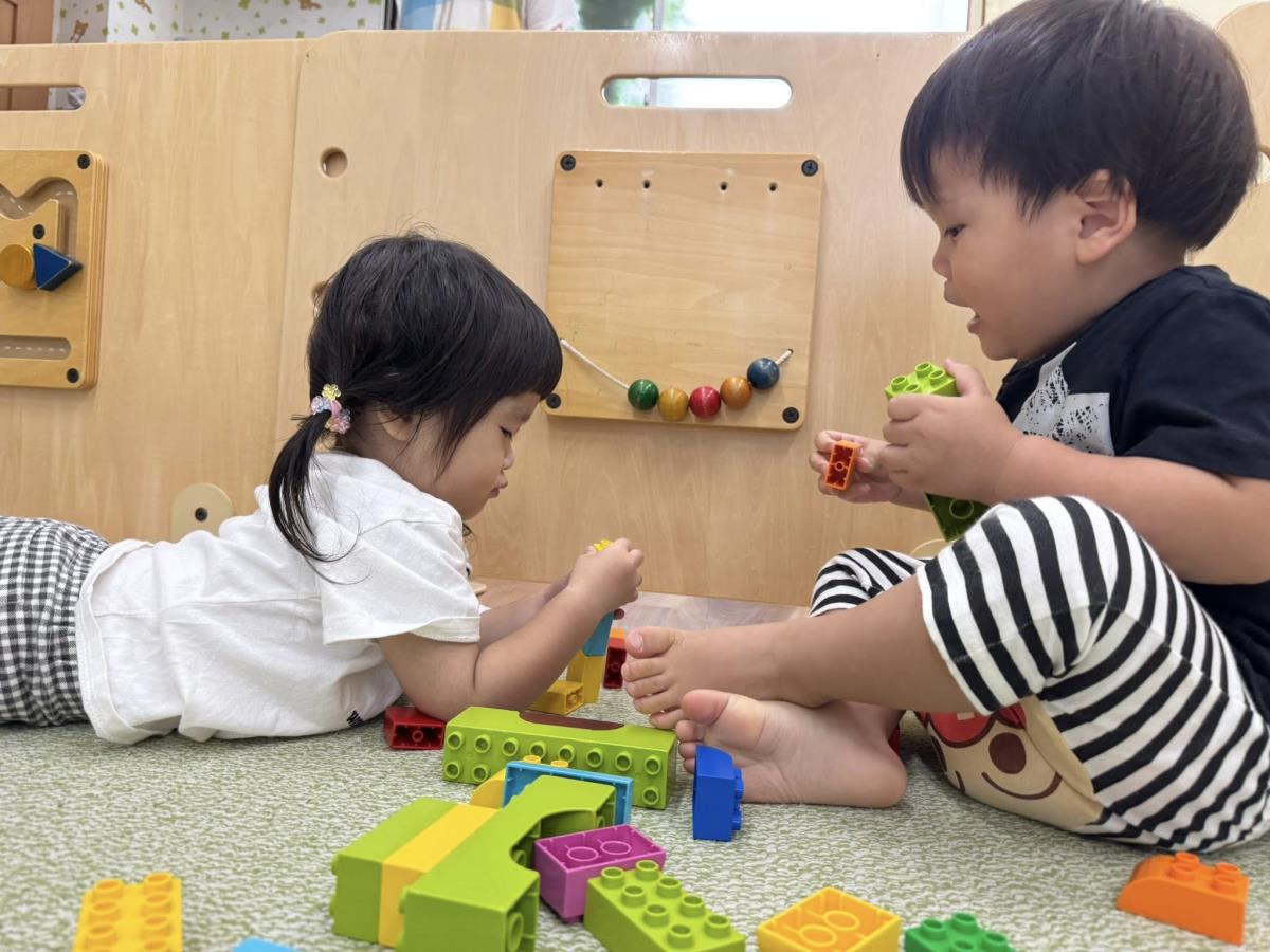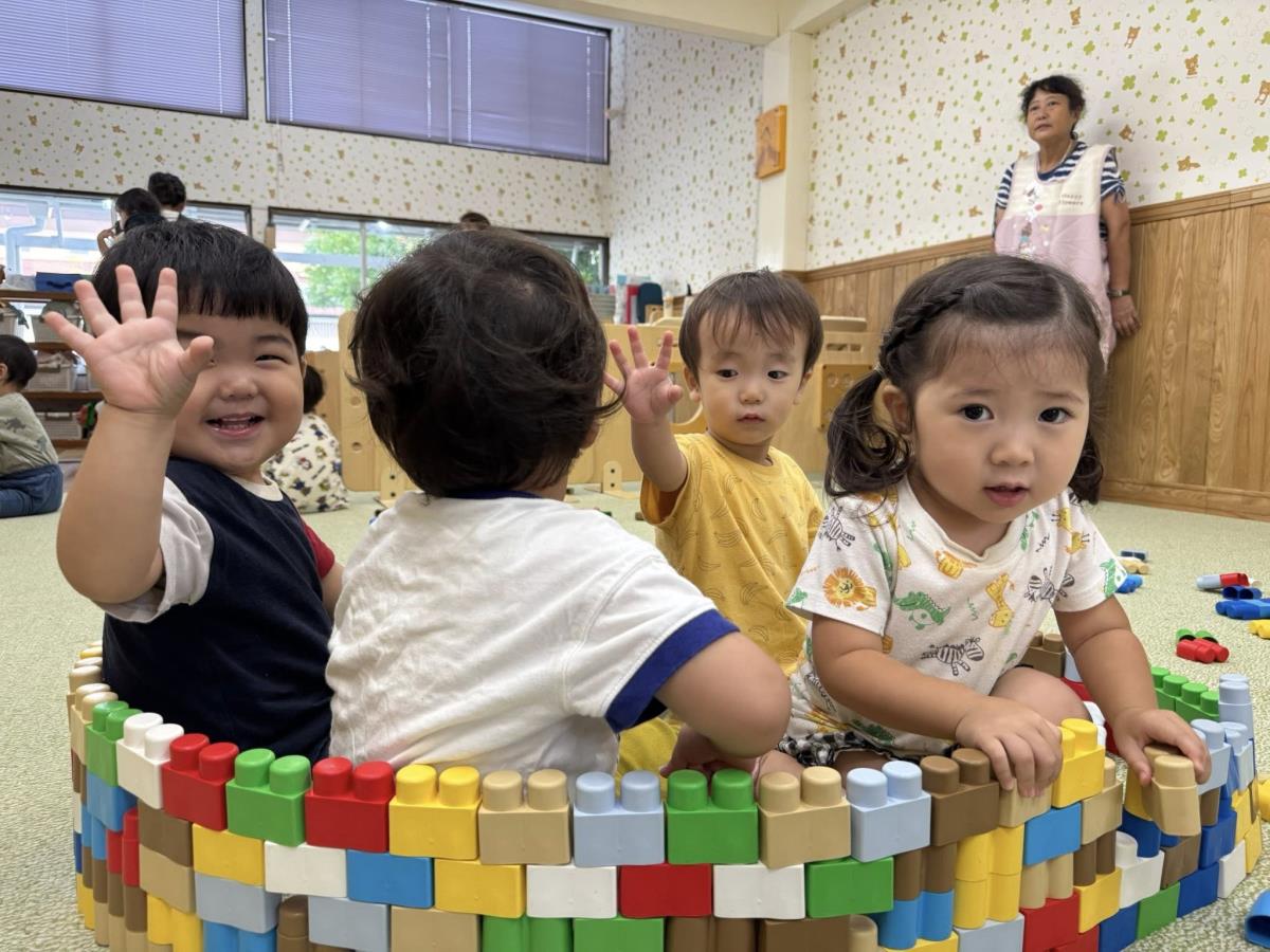 | 園庭で遊びました。お砂場ではお友達が遊ぶ姿をじーっと見て真似をしたり、一緒に遊びたいと手を伸ばし仲良く遊ぶ姿が見られました。スモールハウスの中では、外を覗いてお友達や先生に「おーい!」と元気よく手を振っていました。午後は室内でブロック遊びをしました。消防車や救急車の音が聞こえると、パーテーションから外を眺めてどこかな?とキョロキョロしていました。 |