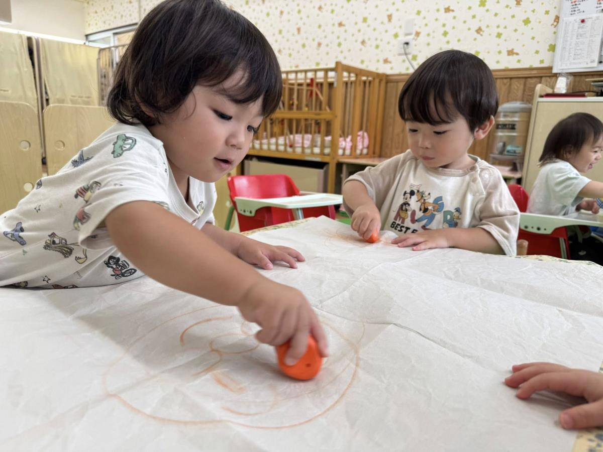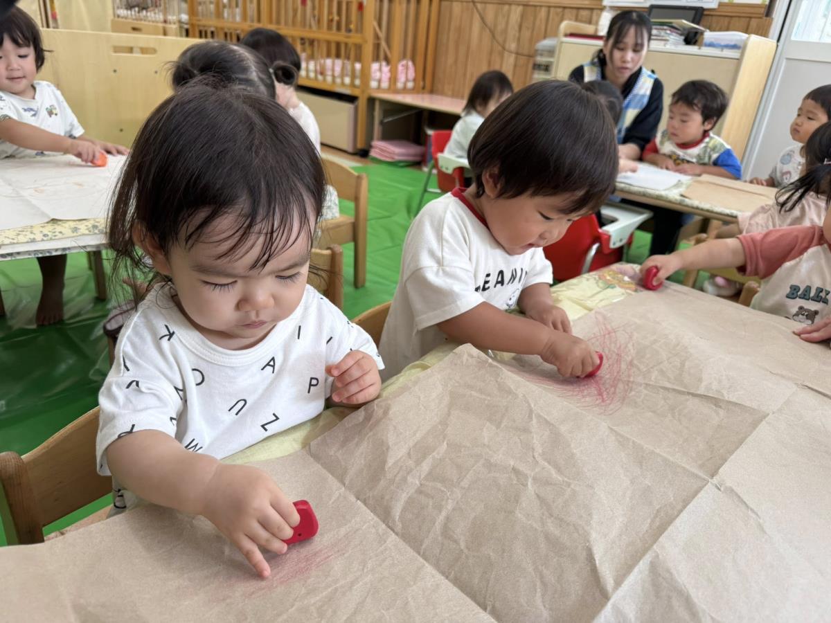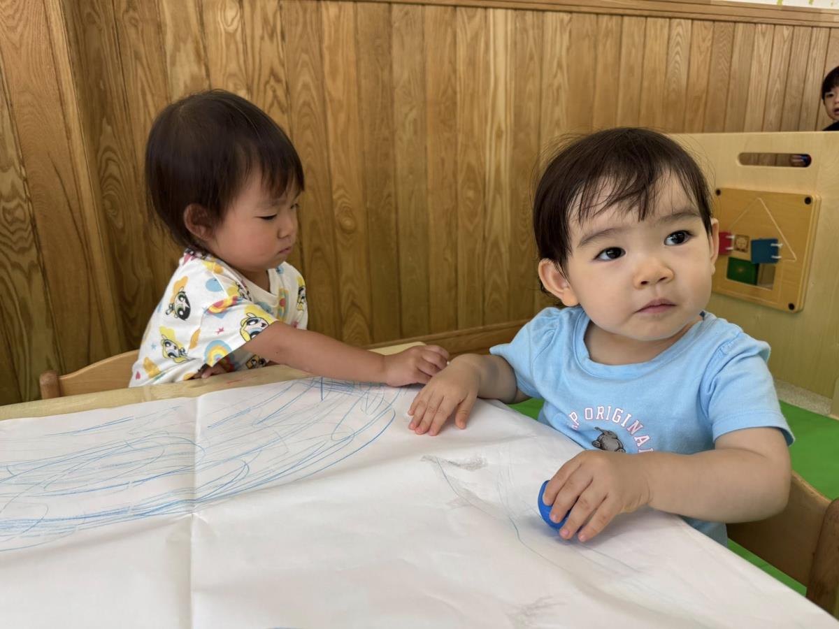 | 今日は室内で大きな紙にお絵描きをしたり、木の型はめパズルをしたりしながら、順番に身体測定をしました。お絵描きでは、赤や青のイシコロールでグルグル〜と大き手を動かしてく描いています。保育士がアンパンマンやお花、星を描くと「あ!」「キラキラ!」と反応して楽しむ姿が見られました。 |