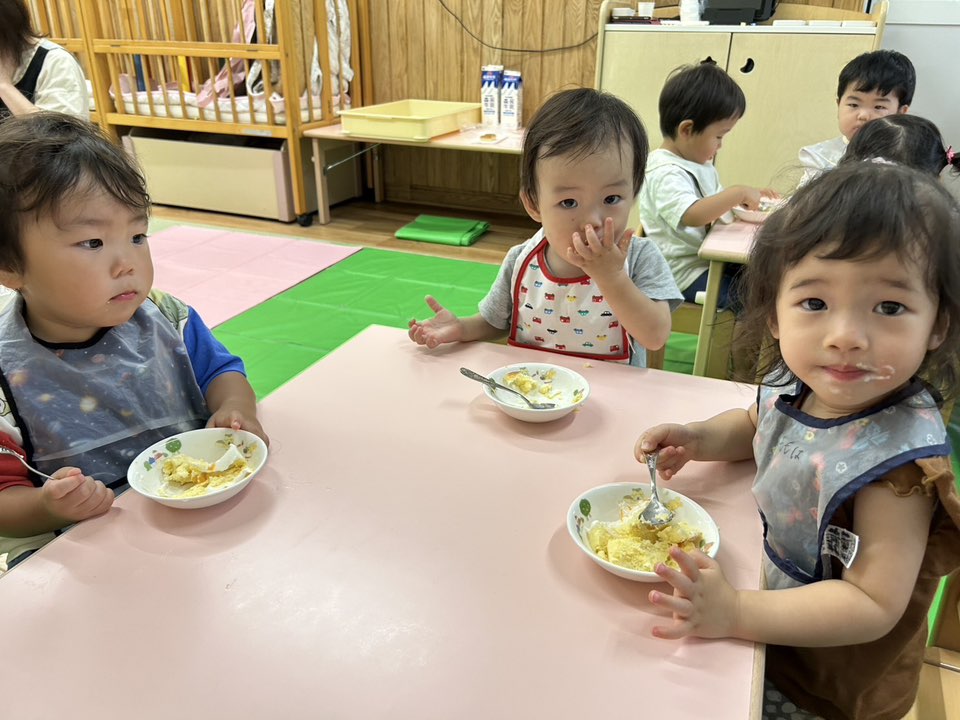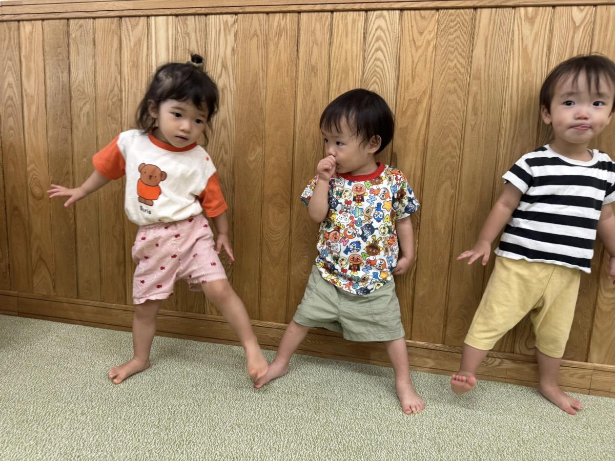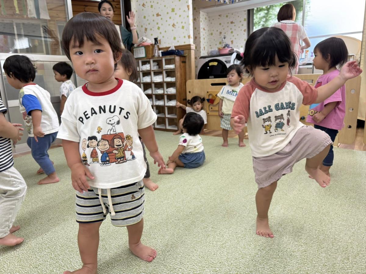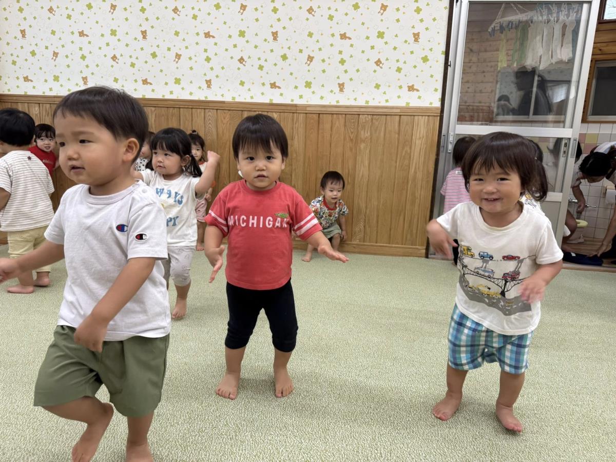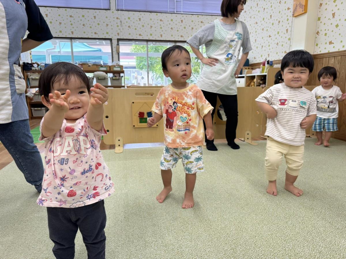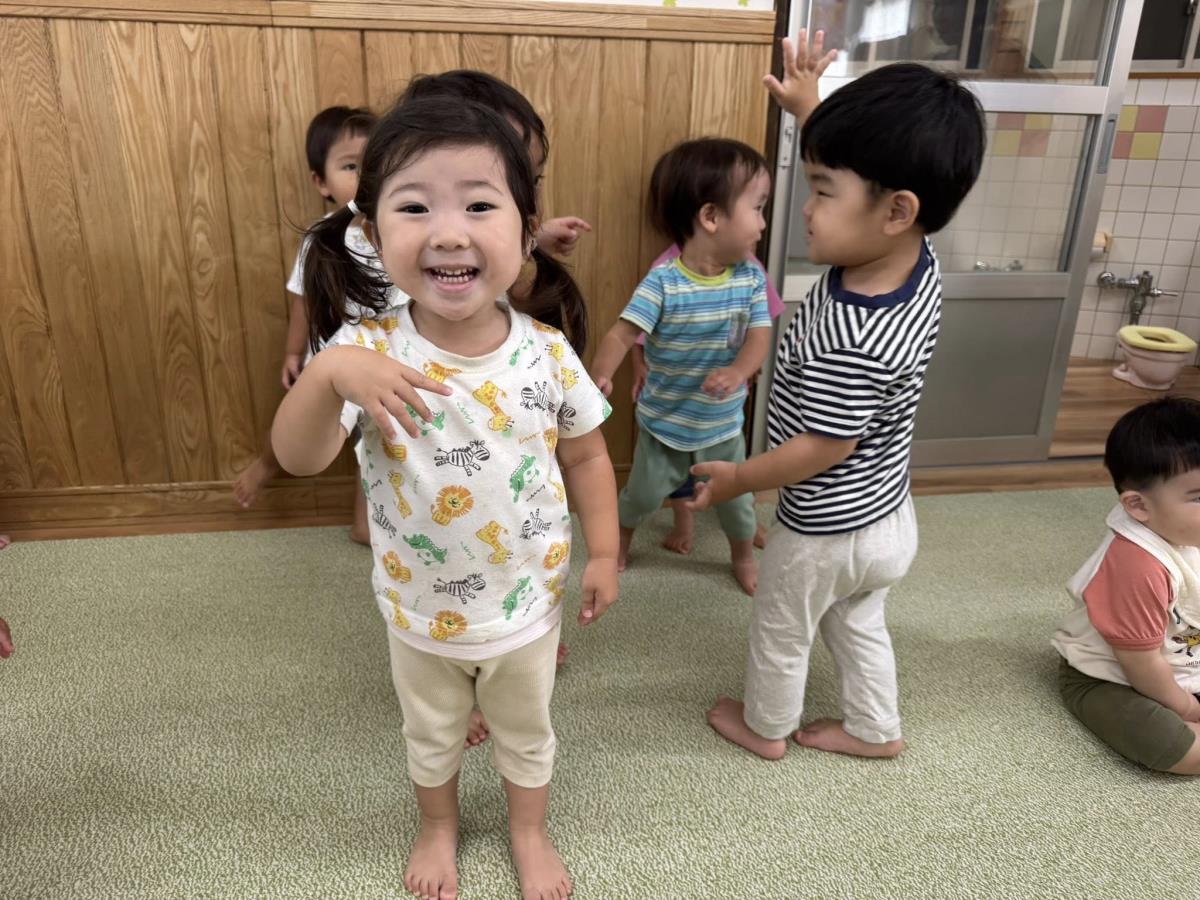 | 今日は園庭のテントの下で、滑り台やお砂場で遊びました。自分で階段をのぼり、シューッ!と楽しそうに滑っていました。保育士が手を添えなくても「自分で!」と手すりをしっかり持って上手に滑っていました。室内では「エビカニクス」や「フルーツポンチ」を踊りました。ノリノリで踊る姿が可愛いです! |