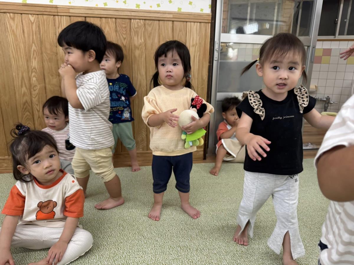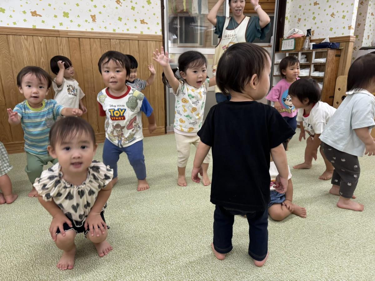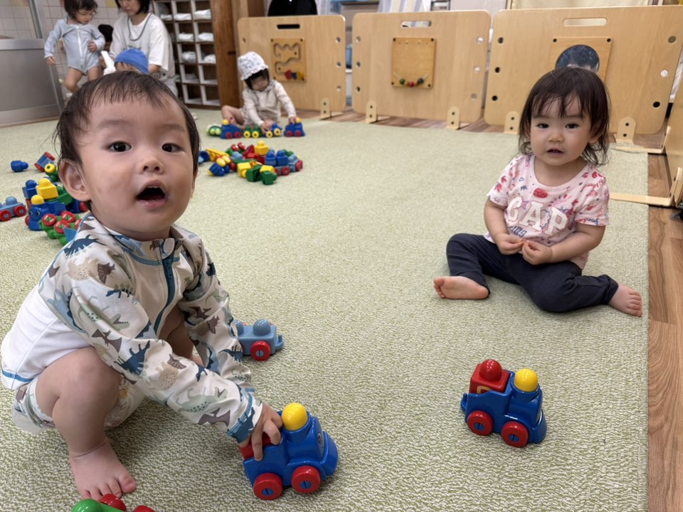| 今日は室内で体操や車のおもちゃで遊びました。「どうぶつでんしゃがやってきた」の音楽を流すとウサギやお猿、ネズミやワニの振り付けを覚えて保育士の動きを見ながら一緒に踊ってくれました♪終わると「もう1回!」と何度も踊って身体をたくさん動かしました。午後はプール納めの会に参加しました。 |