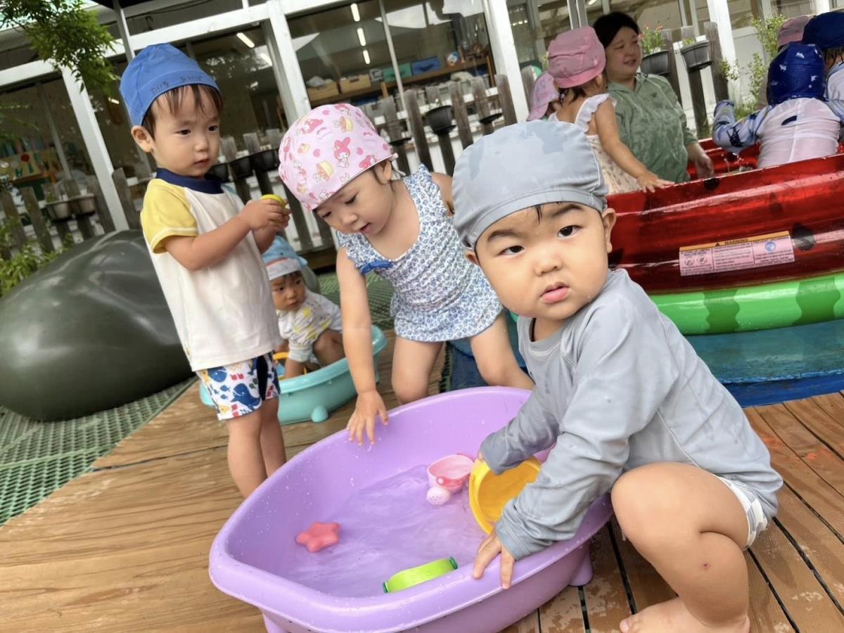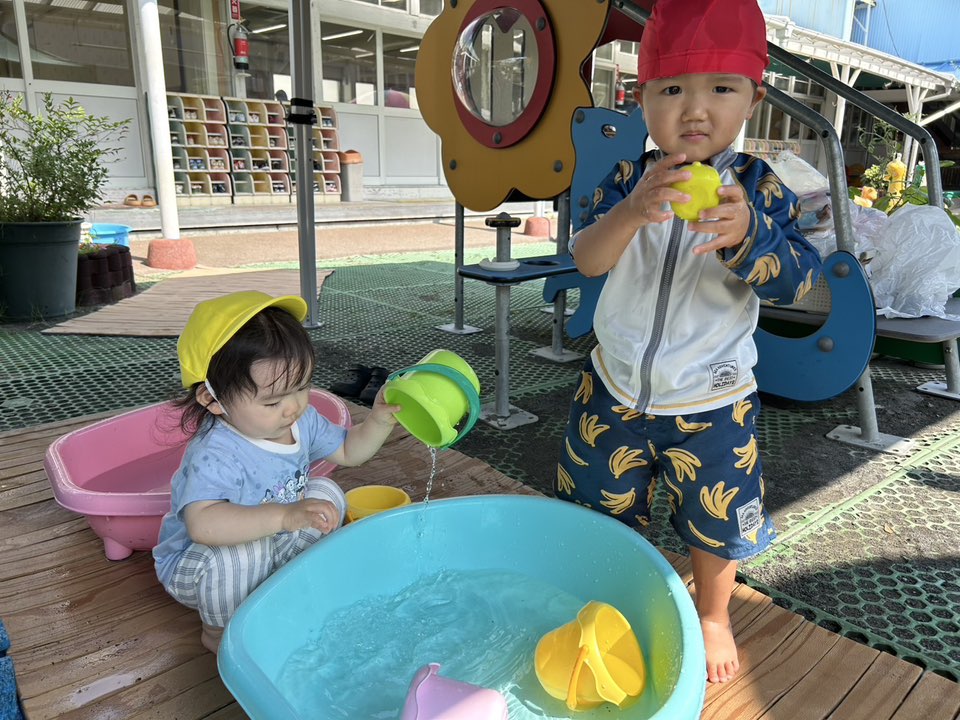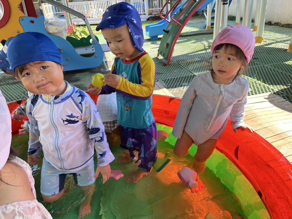 | プール遊びをしました!水着に着替える時、「自分で!」と履こうとしたり、帽子を頑張って付けようとする姿が見られます。お着替えも挑戦しています。まだ足が同じ所に入ってしまったり、お尻の部分がうまくあがらず苦戦していますが、一生懸命頑張る姿が可愛いです♪プールではお友達と一緒に手を繋いで歩いたり、じょうろやバケツでお水を掬ってこぼす遊びを楽しんでいました。 |