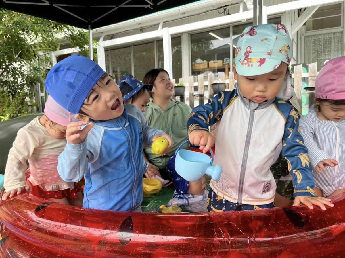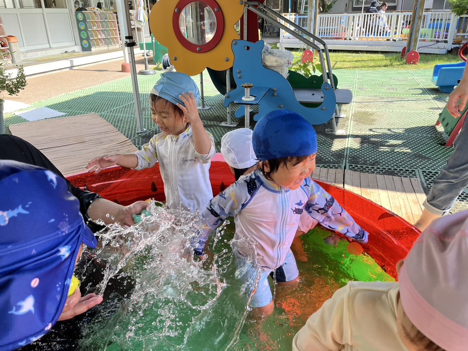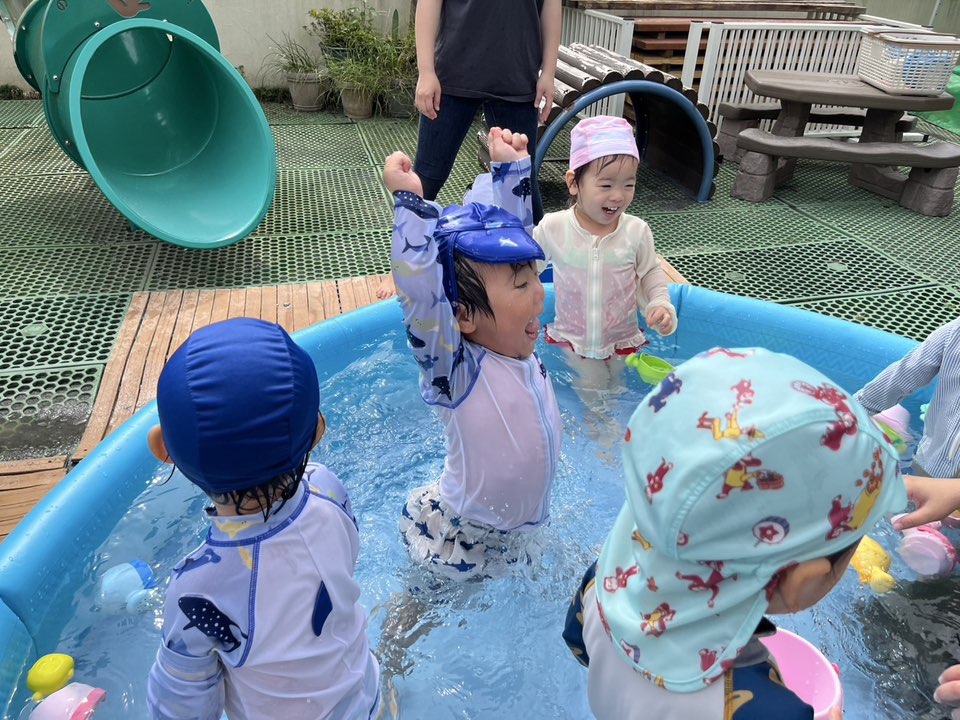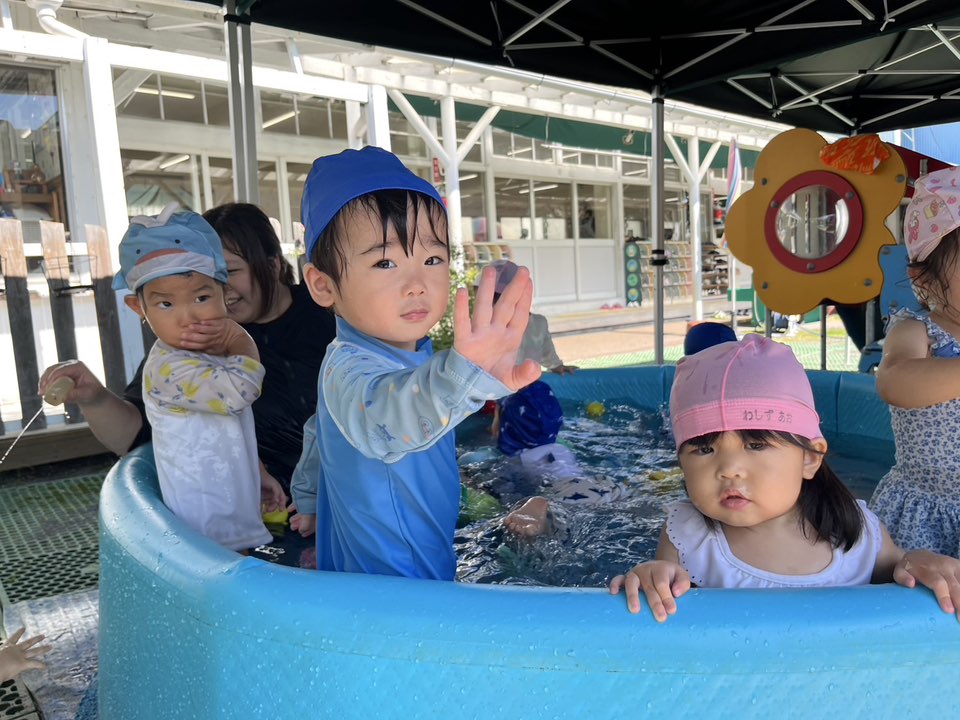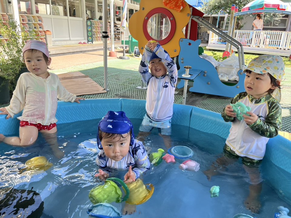 | 今日は今年初めてのプール遊びをしました!水着に着替えると「みてみて〜」と自分の水着を指さして嬉しそうに自慢してくれます。プールの中に入ると、表情が固まる子や嬉しそうに水をすくって玩具で遊び始める子がいて、個々で反応はそれぞれでした♪これからたくさん遊ぼうね! |