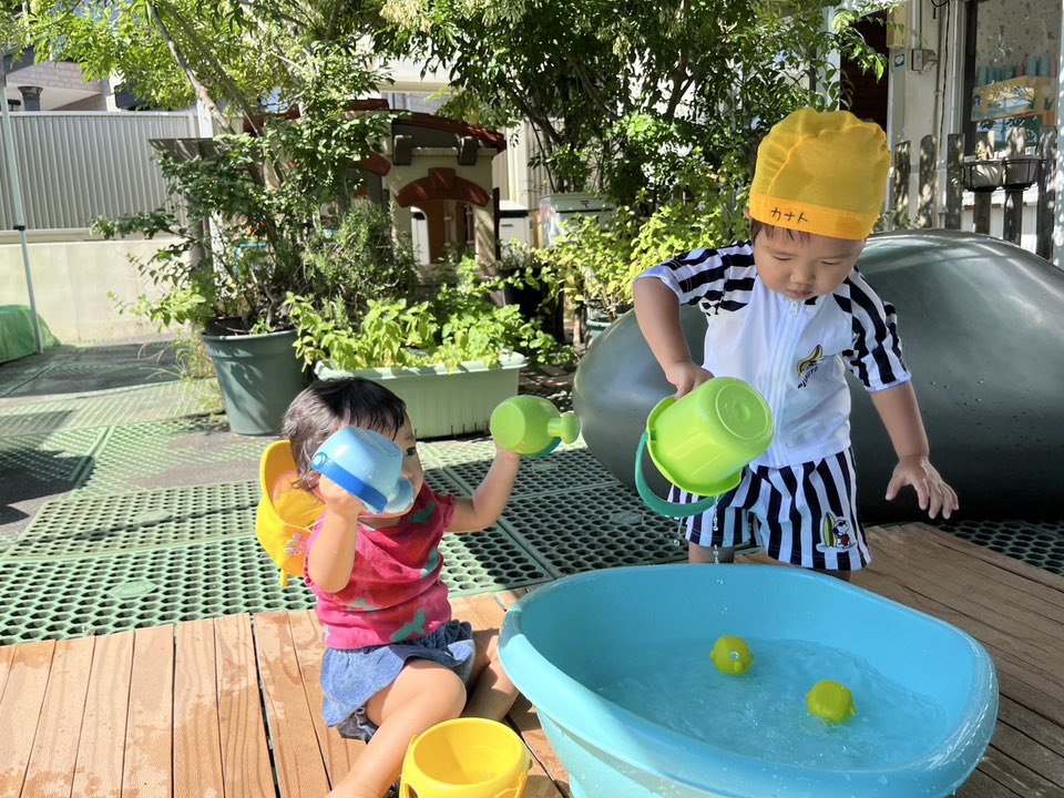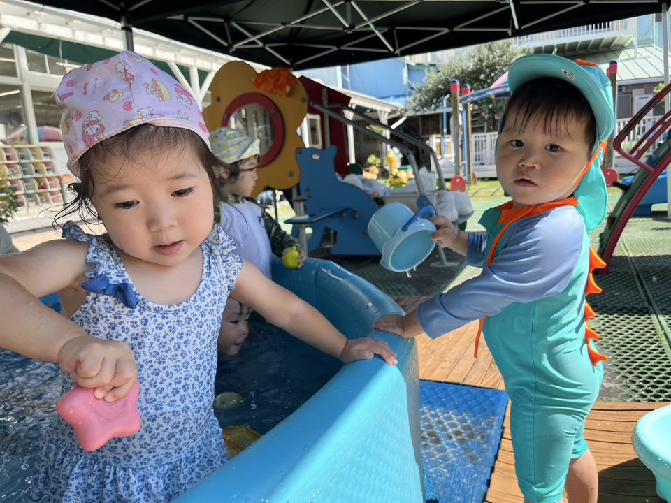 | 暑い日差しの中、テントの下でプール遊びをしました。一緒に遊んでいる0歳児のお友達に玩具を渡してあげたり、ジョウロでお水をかけて一緒に遊ぶ姿が見られました。♪みずをたくさんくんできて~♪と覚えた歌を歌いながらお水遊びを堪能しました! |