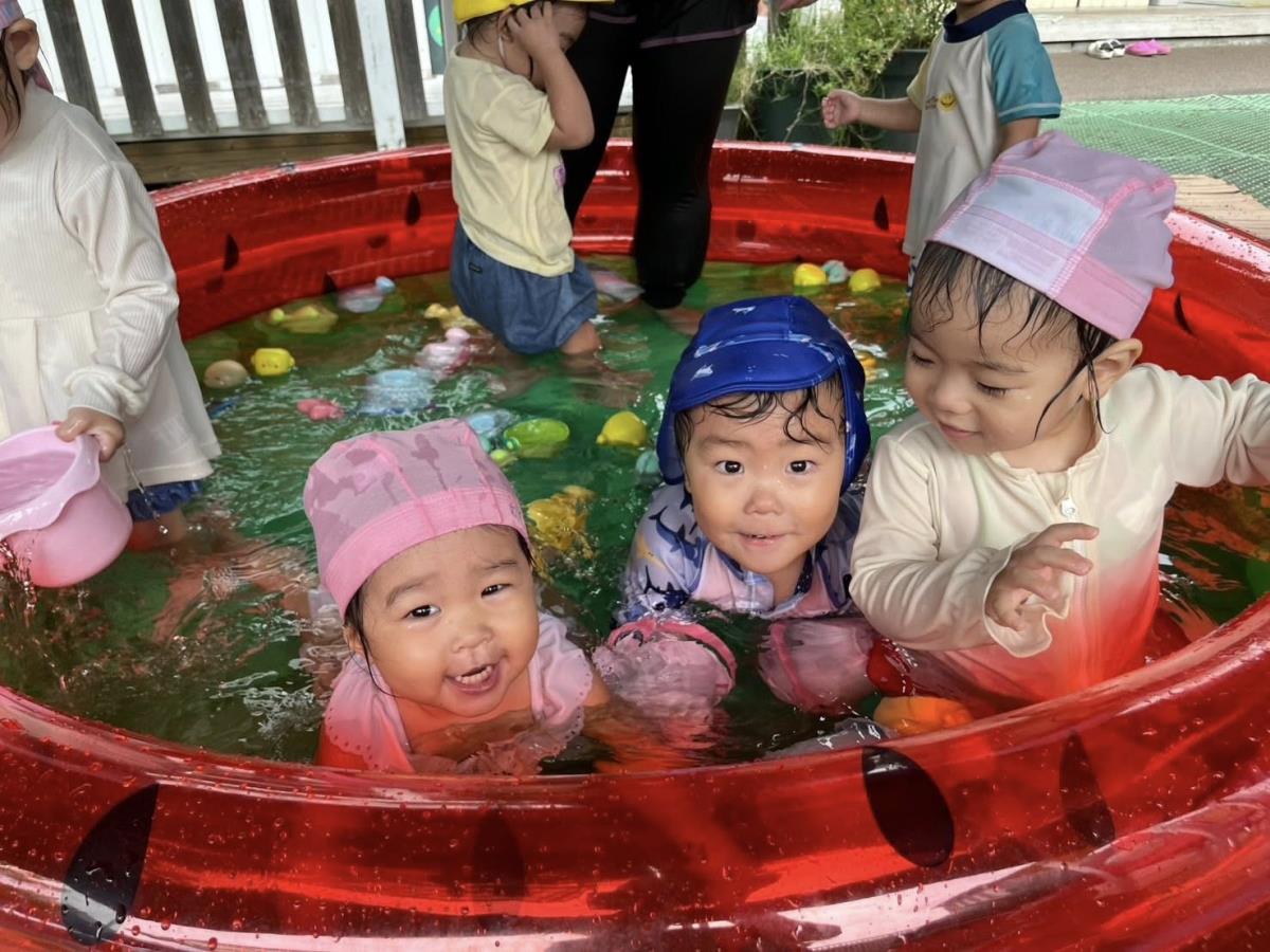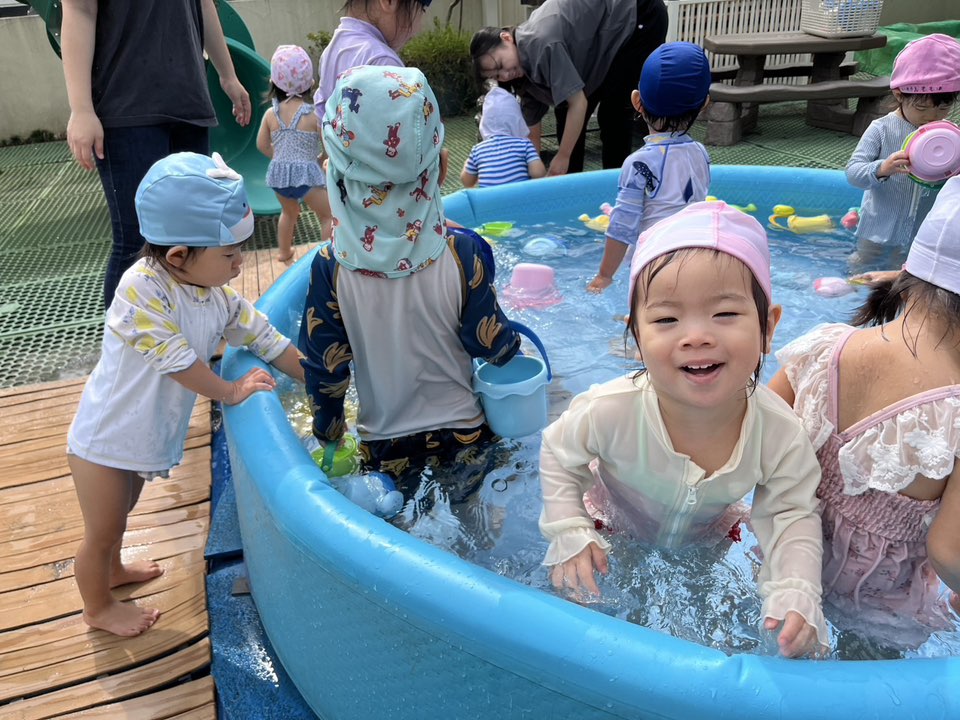 | 今日はプール遊びをしました。最初の頃に比べお水に慣れたお友達が増えて、楽しく遊ぶ姿が多く見られます♪ワニさん泳ぎやプールの中に座って「見てー!」と嬉しそうに披露してくれました。来年は大きなプール!楽しみだね♪ |