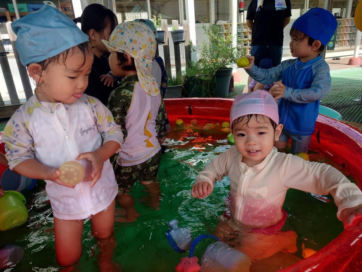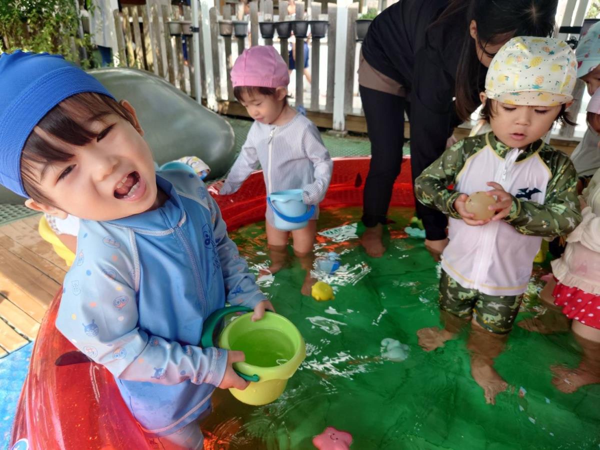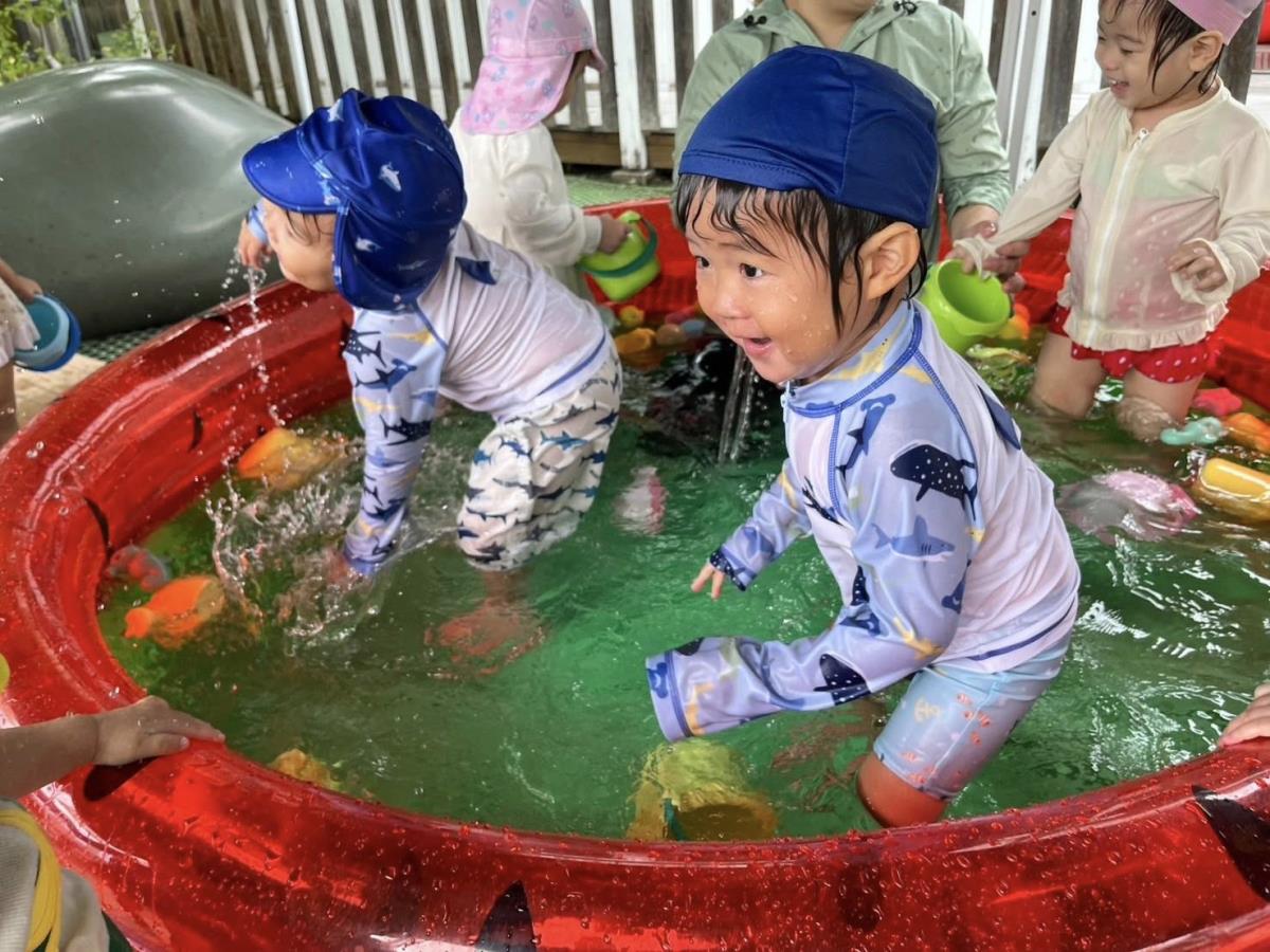 | プール遊びをしました。ひよこ組さんたちは、以前よりも遊び方がダイナミックになってきました。身体を揺らして波をつくったり、手足をバタバタさせて水しぶきを上げたり、水鉄砲を狙った方向に上手に飛ばしたりと、元気いっぱいに楽しんでいます♪お部屋に戻っても「楽しかったね」「明日もやろうね」とお友達や先生とお話していました。 |