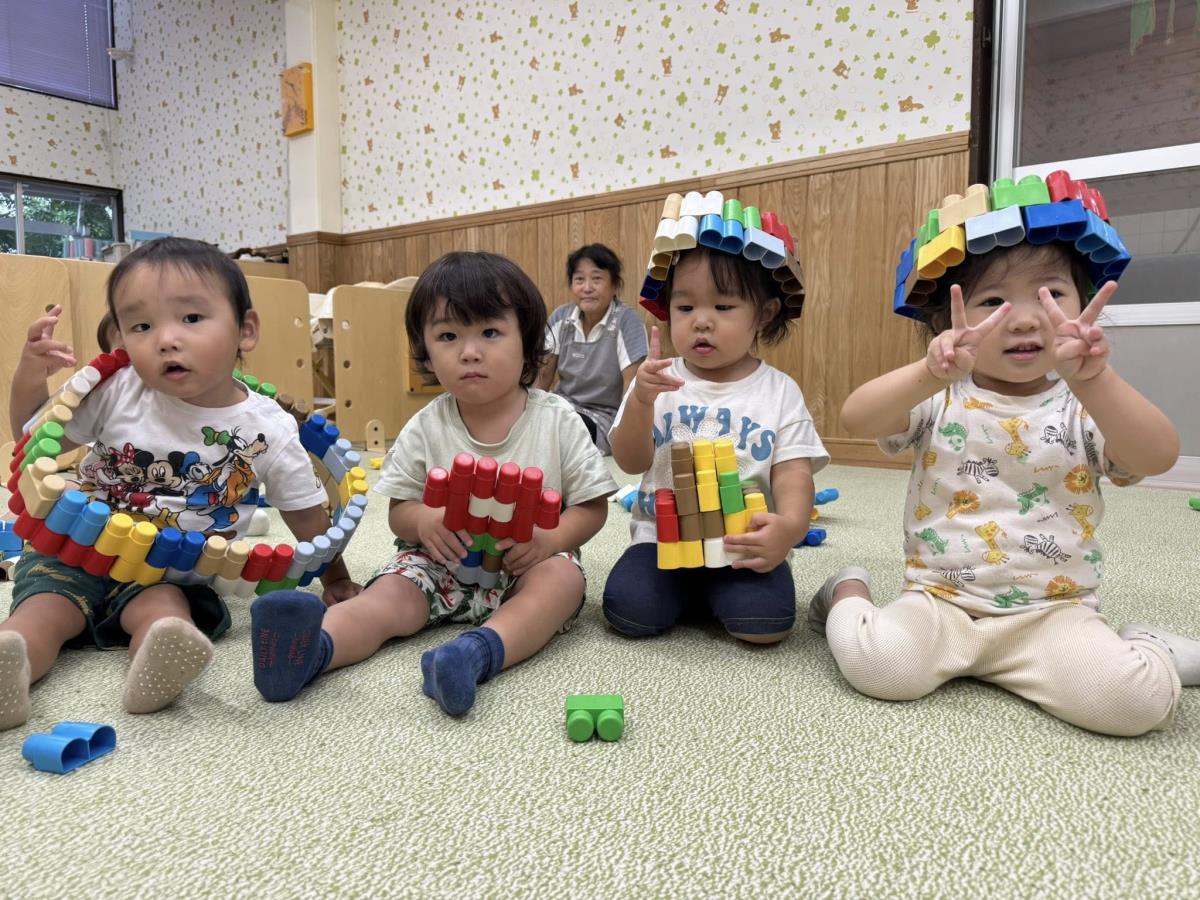 | プール遊びをしました。バケツやジョウロを持ちながら「ピンク!」「きいろ!」「あお!」と色の名前を教えてくれます。まだまだ色と名前は一致する事は少ないですが、皆で楽しそうに話す姿が可愛いです(^^)室内ではレゴブロックで遊びました。お友達と一緒にどこにブロックを付けようか仲良く遊ぶ姿が見られました。 |