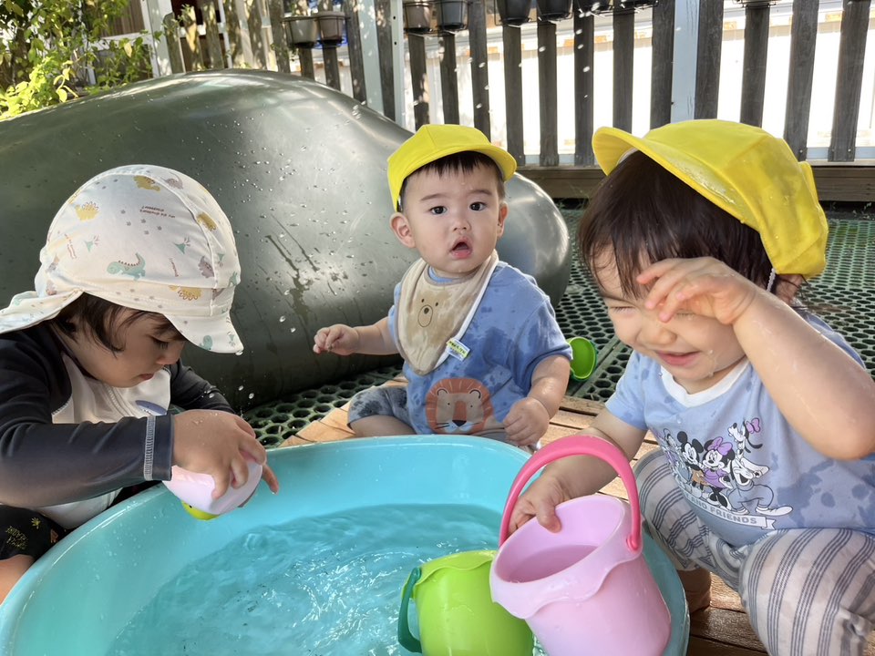 | 今日は水遊びを行いました。タライの中のお水をジョウロやバケツで掬って「ジャバー!」とこぼしていました。両手でお水を弾いて顔にかかると「キャー!」と大喜びしたり、少しビックリして固まる姿も見られました。 |