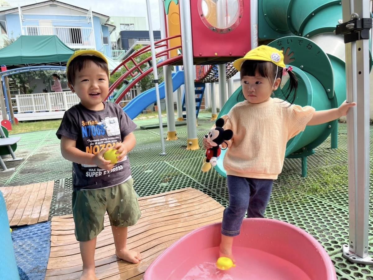 | 今日はプール遊びをしました。プールの中で座って「つめたい!」「気持ちいね!」と嬉しそうに話しています。水鉄砲を押してピューッ!と遠くまで飛ぶとすごーい!と大喜びのひよこさん♪顔にお水がかかってもへっちゃらで、先生やお友達とお水を掛け合って楽しみました。 |