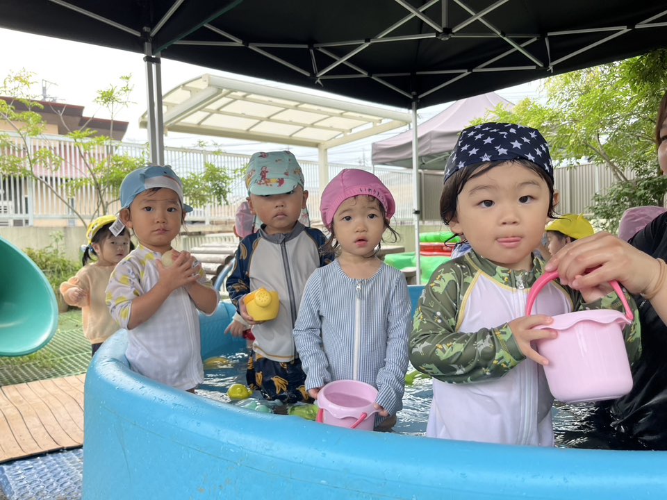 | プール遊びをしました。押すと水が出る玩具を両手に持って、ピュー!と遠くへ飛ぶと大喜び!何回も遊ぶ姿が見られました。冷たいお水が気持ちいいのか、バケツですくったお水を顔から被る子もいました♪ |