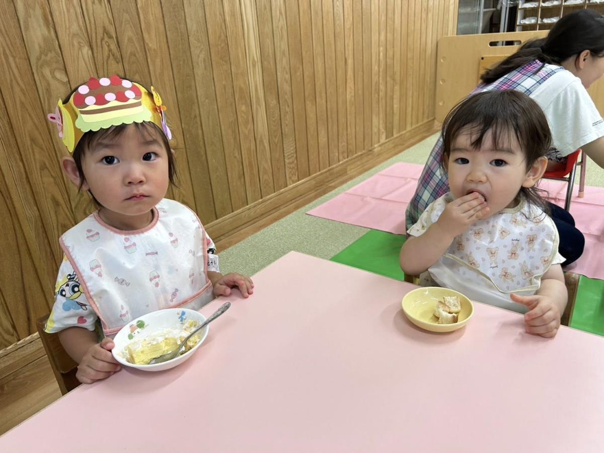 | 今日は6月のお誕生会に参加しました。1歳クラスからも3人のお友達が皆にお祝いして貰いました♪保育士からのプレゼントのパペットシアターでは、音楽に合わせて体を揺らしたり拍手をしています。時折声を上げて笑い楽しみました。おやつのケーキ、美味しかったね♪ |