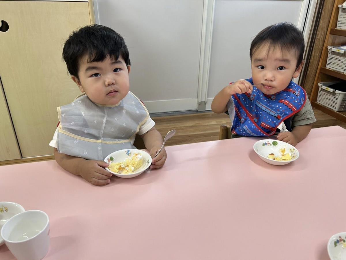 | 今日は5月のお誕生会に参加しました。1歳クラスからも1人のお友達が皆にお祝いしてもらいました。お歌に合わせて身体を揺らしたり、拍手をして楽しみました。お給食ではミートボールが大人気!たくさんおかわりしているお友達もいました(^^) |