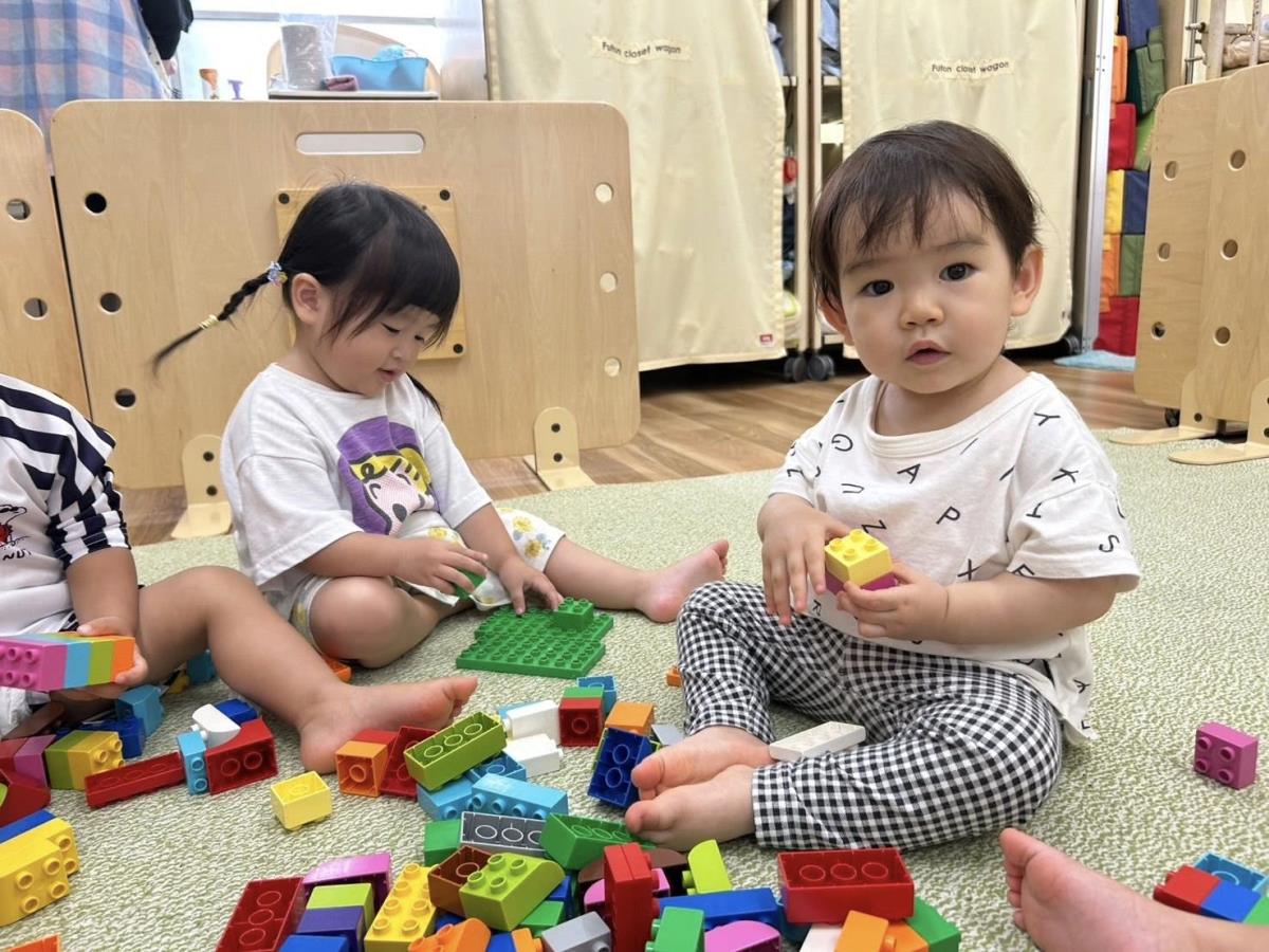 | 今日は園庭遊びをし、お部屋に入ってからはレゴブロックで遊びました。レゴブロックで電車を作るのが流行りのひよこ組さん。長いブロックで電車同士を繋げ、運転手代わりなのか動物や人型のブロックを乗せて、といったように工夫が見られました。 |