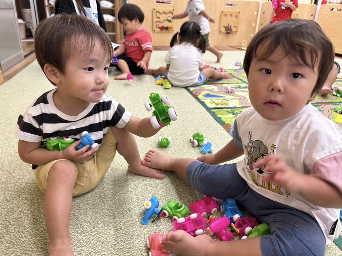 | プール遊びをしました。水鉄砲の扱いが上手になってきて、狙った方向へ飛ばしています♪お友達や先生と掛け合いながら楽しむ姿が見られました。室内では車のおもちゃで遊びました。レールの上に車を並べたり、お友達が持ってる車と同じ色の車を探して、「同じ!」「一緒だ!」と笑いあっていました。 |