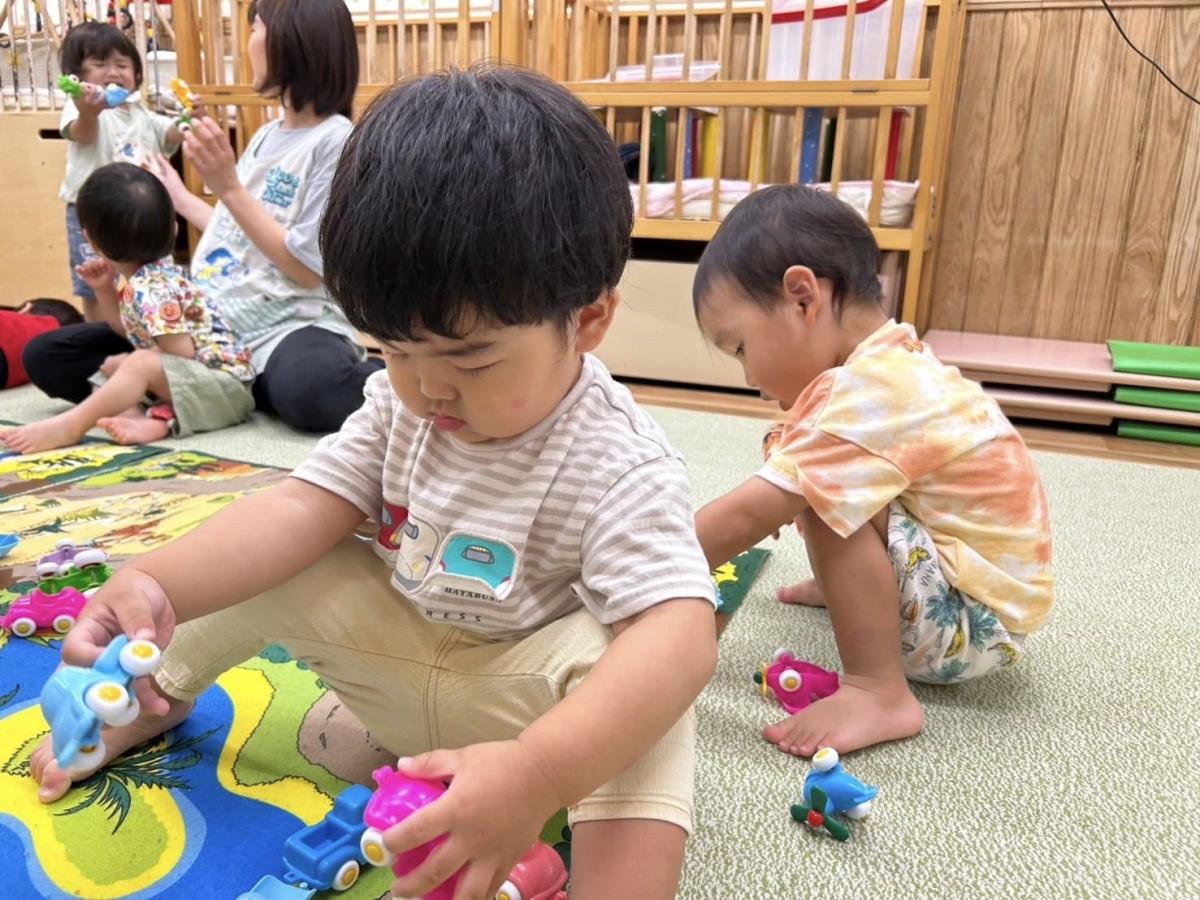 | 今日は体操やダンスをした後にパズルや木製の車の玩具で遊びました。サンサン体操やエビカニクスをノリノリで踊る姿がとても可愛らしかったです。パズルでは、集中して取り組む様子が見られ、上手くはまると「先生ー!」と嬉しそうに保育士を呼ぶ子もいました。 |
