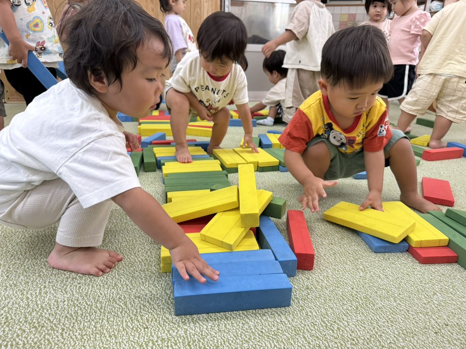 | 今日は暑さが厳しかったので軽くプールで汗を流し、その後はお部屋で遊びました。1人のお友だちがブロックの車を走らせ始めると乗り物を持った他のお友だちが後を追って自然と列ができ道を作っていました。 |