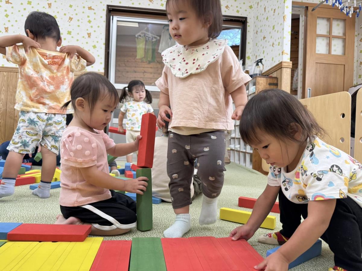 | 今日は室内で体操やスポンジブロックで遊びました。音楽が流れると体を揺らしてリズムに乗って踊っています♪腰に手を当てて、お尻をフリフリする姿が可愛いです(^^)スポンジブロックでは、長いブロックで道を作りバランスを取りながら歩いたり、坂道を作って丸いブロックを転がして楽しむ姿が見られました。 |