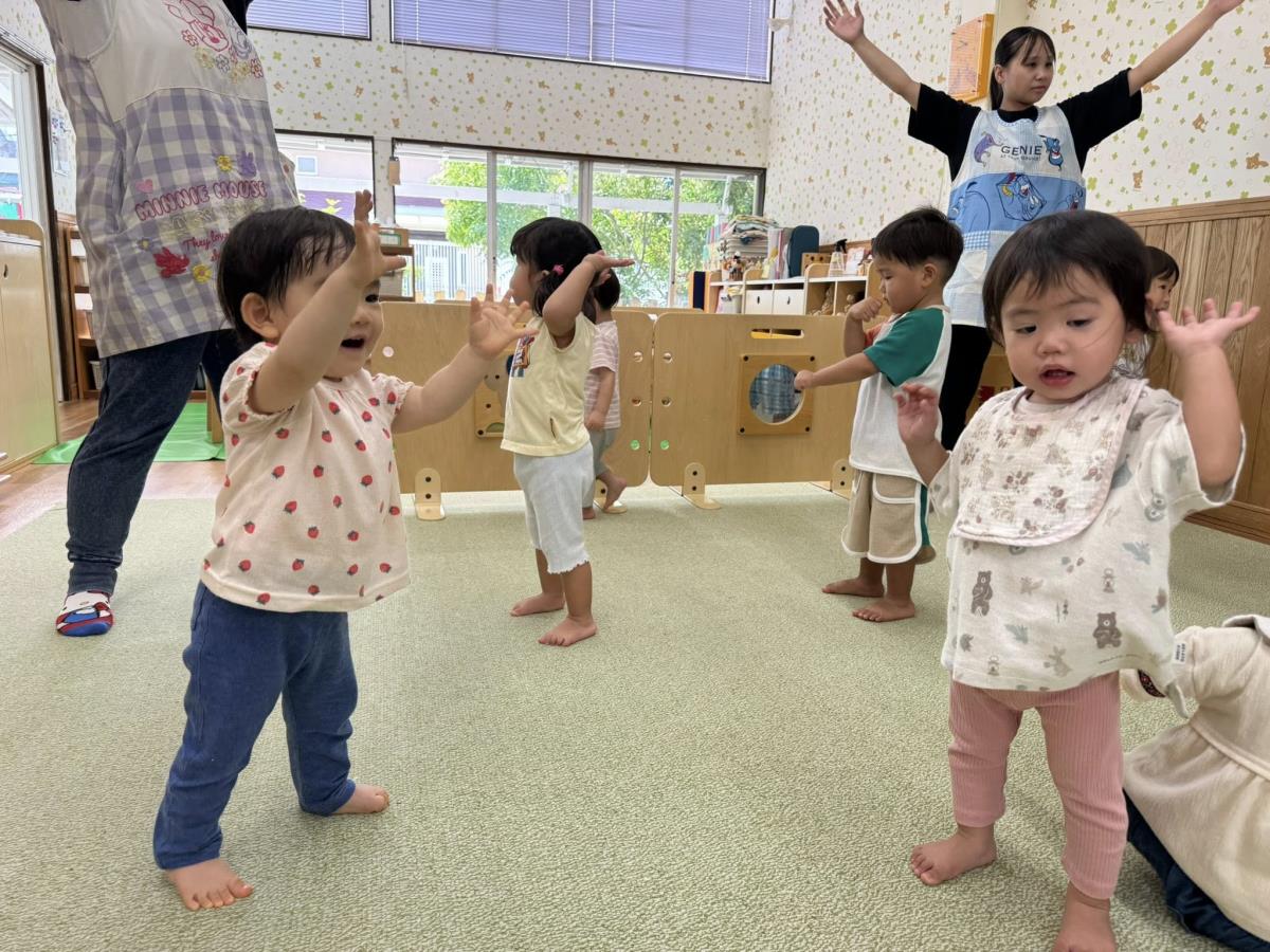 | 今日はお部屋で体操や木の玩具で遊んで過ごしました。体操ではジャンボリミッキーやからだダンダンなど沢山踊りました。先生の真似をしながら、いえい!と最後の決めポーズまでしっかり踊ってくれました。 |