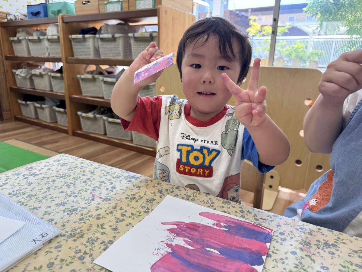 | 今日は園庭でたっぷり遊びました。お砂場ではプリンや虫、車の型を取って「出来たー!」と嬉しそうな姿がみられます♪室内では絵の具を使ったお製作をしました。最初は絵の具を触ることに抵抗があったお友達も、他のお友達が挑戦する姿を見て一緒に触ってくれました! |