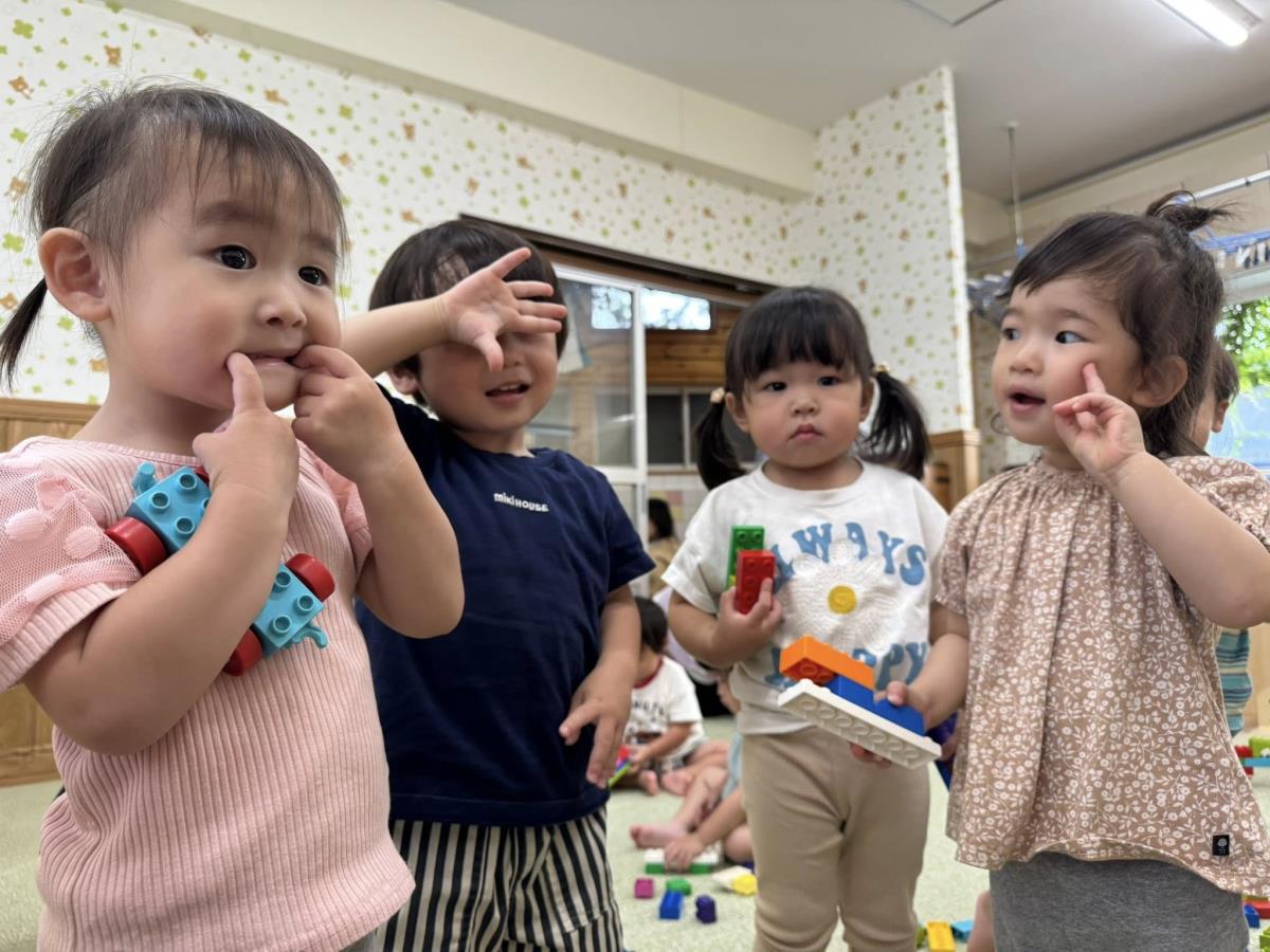 | プール遊びをしました。お気に入りのおもちゃを持ってお水遊びを楽しんでいます。水鉄砲の扱いも上手になり、狙った方向へ飛ばせるお友達も増えてきました!お水が飛んで驚くお友達や先生を見て喜ぶ姿が可愛いです♪午後はレゴブロックで遊びました。先生が作ったものにブロックを付け足して「ケーキだ!」と嬉しそうなひよこさん。皆でハッピーバースデーを歌って最後は「ふー!」とロウソクを消す振りをして楽しみました。 |