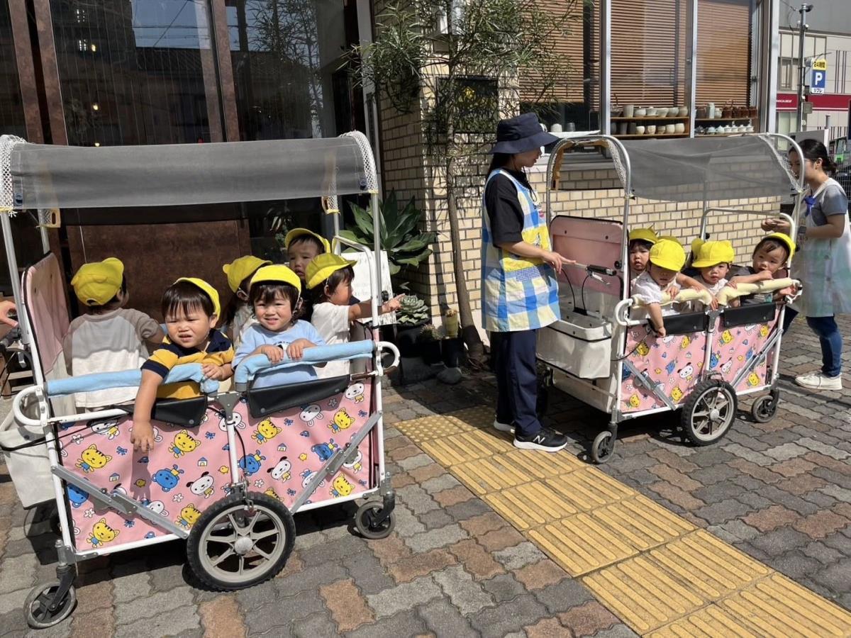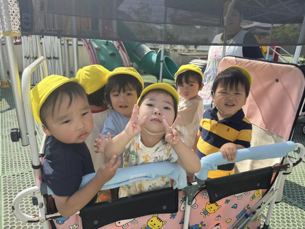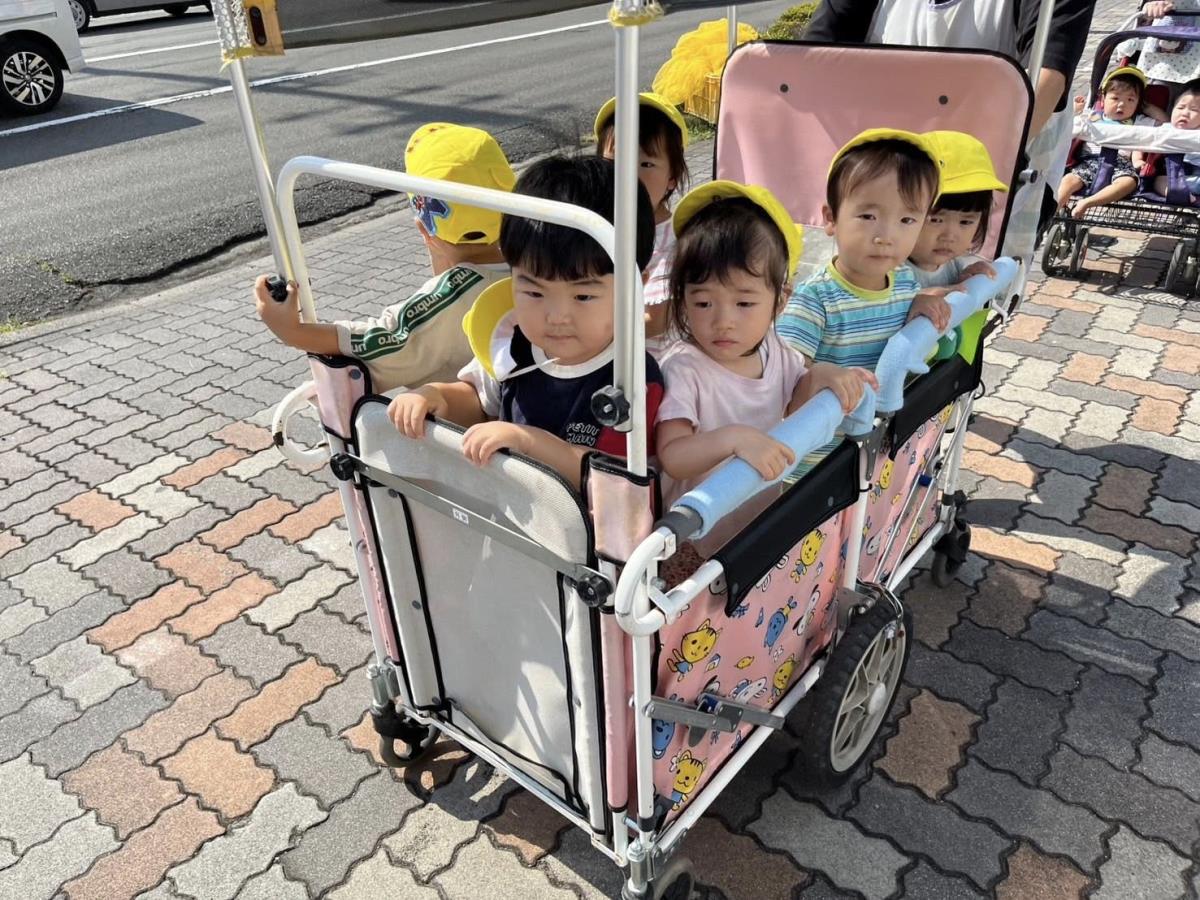 | 今日は久し振りのお散歩に出かけました!ベビーカーに乗って周りをキョロキョロするひよこ組さん♪タンクローリーを発見すると「あ!」と指さして嬉しそうに反応しています。通行人の方に挨拶をしたり、行き交う車に手を振って楽しむ姿が見られました。まだまだ日差しが暑かったので早めに園に戻り室内で過ごしました。 |