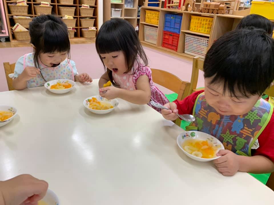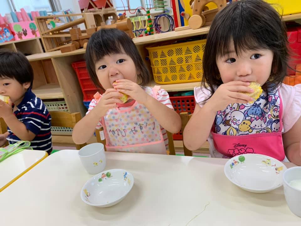 午前のおやつの時間です。 みんなそろってごあいさつ♪ お菓子や牛乳など軽食をいただきます。