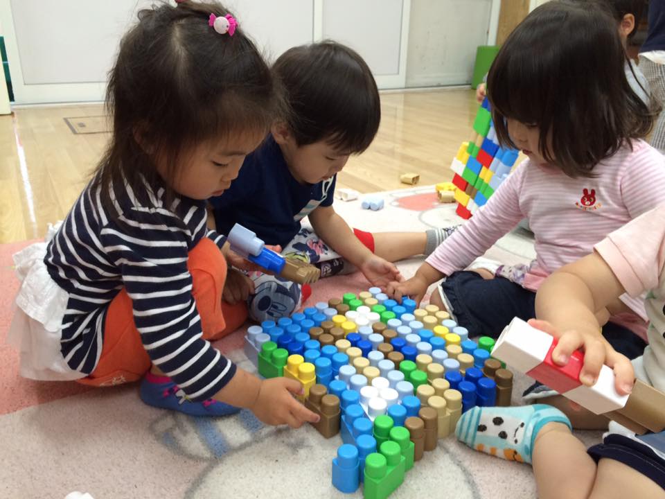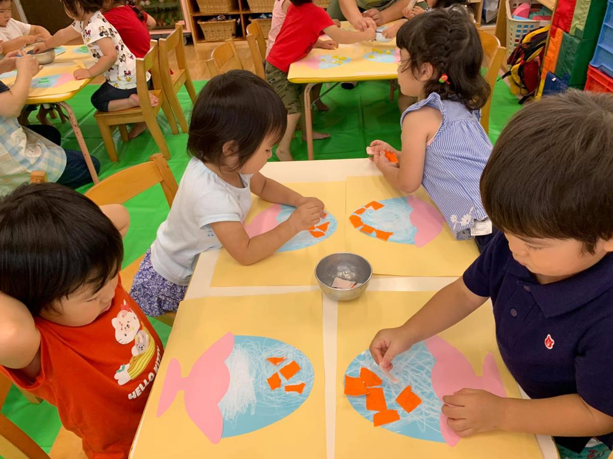 自分の出席帳にシールを貼ります。 貼り終えたら、あそび・学びの時間です。 おりがみ制作や絵の具あそび・お絵描きやブロック遊び、園庭遊びやお散歩に出かけたり・・・ 夏になるとデッキがプールに早変わり!園庭にも丸いプールが出ます。 いっぱいあそんで、いっぱい学びましょう☆ |