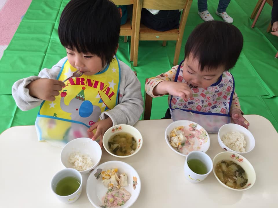 毎日給食室で手作りのお給食です。好き嫌いなく何でも食べて、元気に過ごしましょう。 |