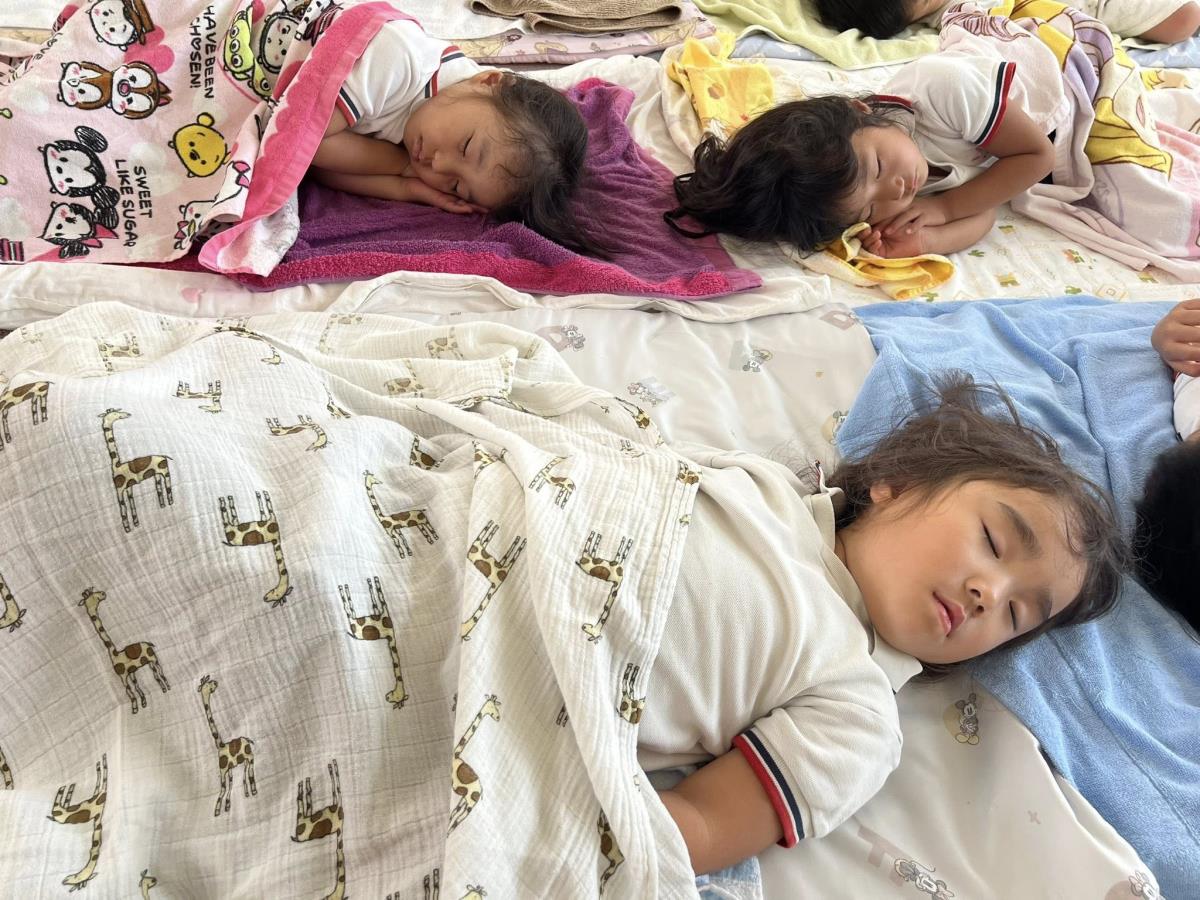 お給食が終わり、おトイレを済ませると午睡です。 もも組さんの午睡は夏の終わりまでです。