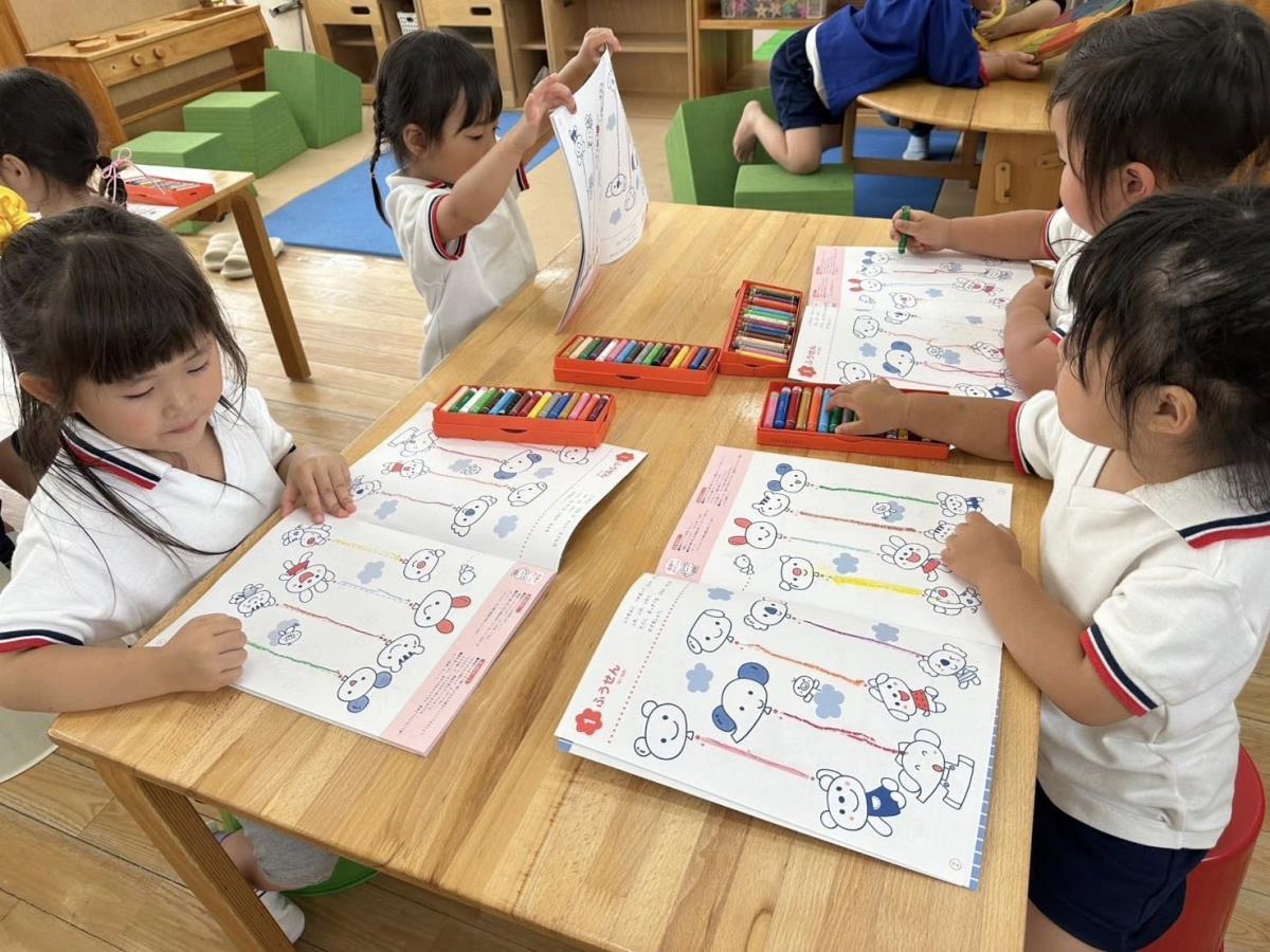 自分の出席帳にシールを貼ります。シールを貼り終えたら、活動に入ります。 ワークや制作・ブロック遊びなど室内遊び、園庭遊びやお散歩に出かけたり、夏になるとデッキがプールに早変わり!月に2回リトミックも行います。